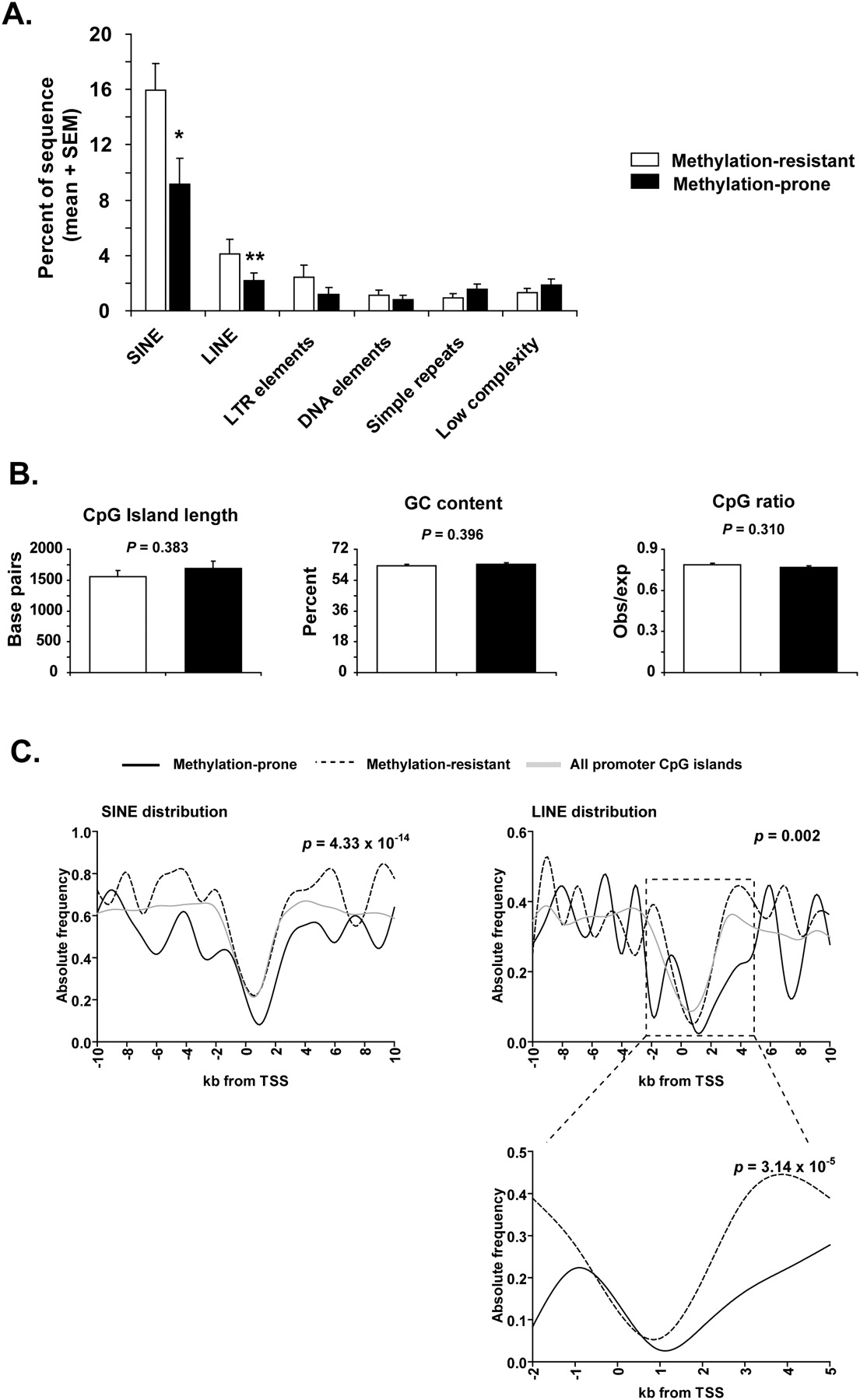 Distribution of repetitive elements in methylation-prone versus methylation-resistant genes. (A) The abundance of repetitive elements of different classes was determined for the 4-kb sequence window centered in the TSS of 36 methylation-resistant (white) and 36 methylation-prone (black) genes. Retrotranposons of the SINE and LINE classes were found to be depleted in methylation-prone genes. *P < 0.02; **P < 0.12 (Student's t-test). (B) Average length, GC content, and CpG ratio of CpG islands were not significantly different between methylation-prone and methylation-resistant genes. Error bars represent SEM. (C) Abundance of SINE and LINE retrotransposons in the 20-kb sequence window centered in the TSS of 36 methylation-prone and 36 methylation-resistant genes. The abundance of SINE and LINE retrotransposons in all promoter CpG islands in the human genome is shown in gray. Note that the depletion of LINE retrotransposons is more significant in the −2-kb to +5-kb sequence window.