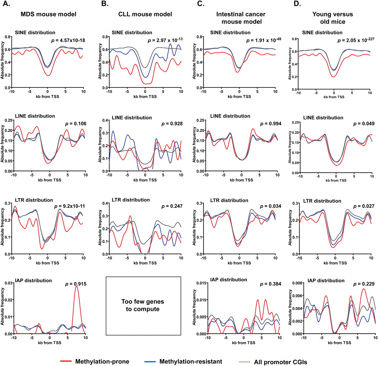 Frequency of retroelements in methylation-prone and methylation-resistant genes identified in mouse cancer models and old mice. (A) Depletion of SINE and LTR but not LINE repeats near TSS marks methylated promoter CpG islands in a mouse model of myelodysplastic syndrome (MDS). Bone marrow samples of three NUP98-HOXD13 transgene animals that developed MDS (Lin et al. 2005) were studied by MCAM. Bone marrow samples from nontransgene animal of the same mouse strain was used as control, and the methylation status of approximately 6000 CpG island promoter genes was determined in the MCAM experiments. (B,C) The same pattern of retroelements depletion is observed in hypermethylated genes in CLL (Chen et al. 2009) and intestinal cancer mouse models (Hahn et al. 2008). (D) Depletion of SINE, LINE, and LTR repeats near TSS also marks age-related methylation promoter CpG islands. Small intestine tissue harvested from young (3-mo-old) and old (35-mo-old) C57BL/6J mice were used in MCAM experiments to identify age-related methylation.