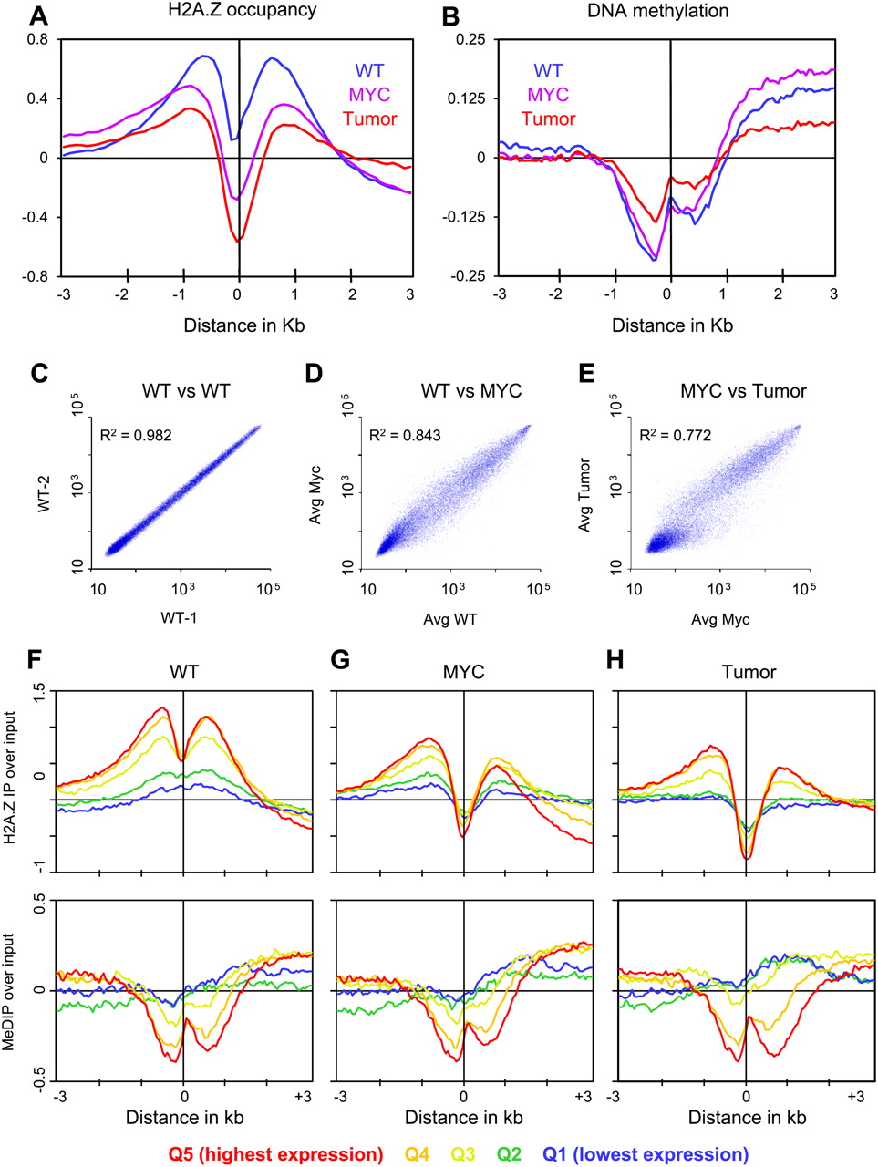 H2A.Z and DNA methylation occupancy around TSSs. Genes were aligned at the TSS and the normalized probe signals were averaged in 50-bp bins for H2A.Z occupancy (A) and DNA methylation (B). (C–E) Comparisons of microarray expression data for each cell type. (F–H) Genes are aligned at the TSS and divided into quintiles (Q1–Q5) by decreasing expression level. The ChIP with microarray hybridization (ChIP-chip) data were normalized by computing standard deviates for each probe.
