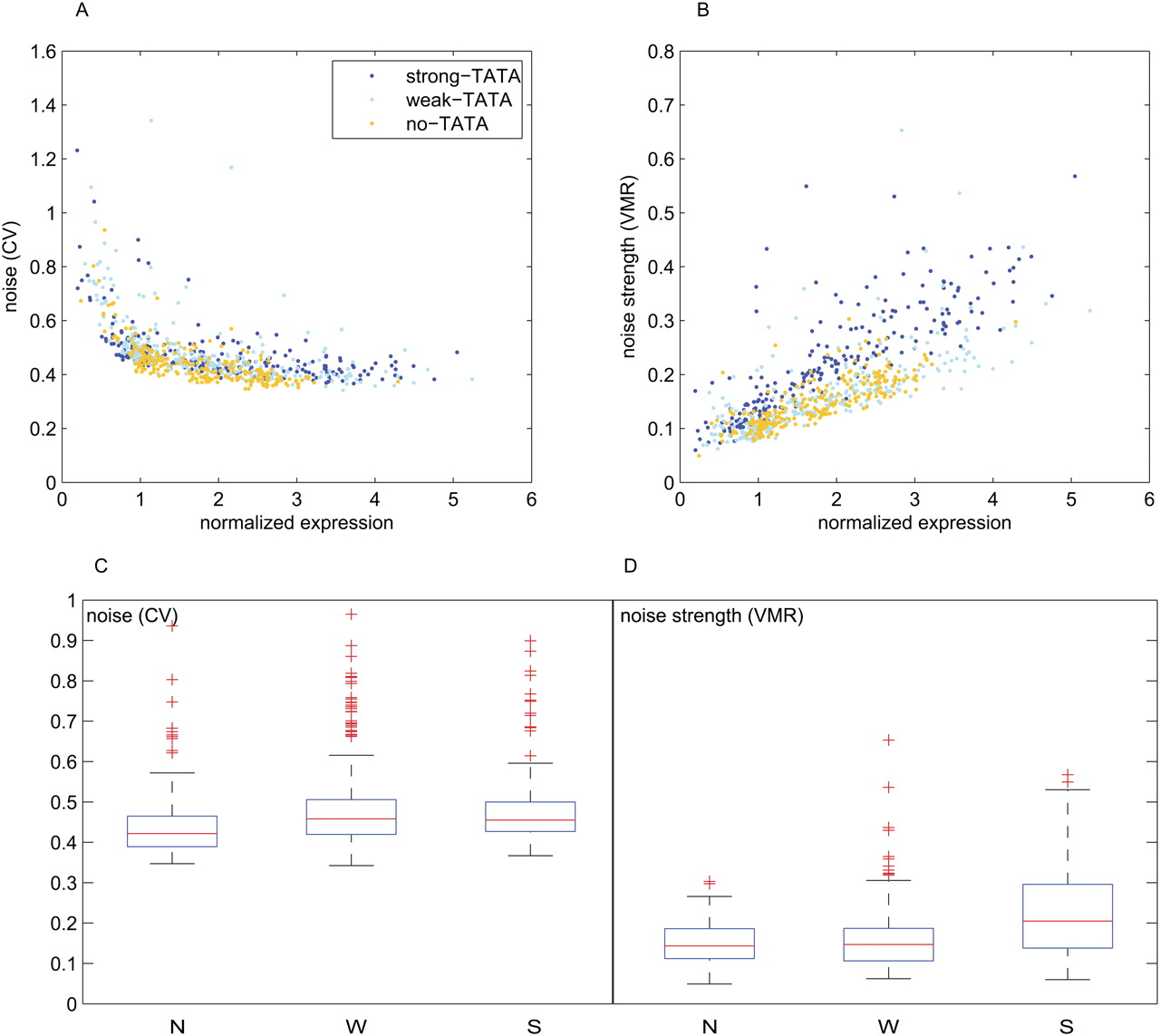 Transcriptional noise in different promoter libraries. Noise of each individual clone is plotted against the mean expression. Normalized expression means that the expression value (fluorescence/volume) for each clone was divided by the expression of its basal promoter (promoter with same TATA but no TF binding site), so that each clone is expressed in terms of fold changes with respect to their basal promoter. (A) Noise versus normalized expression for the three libraries. (B) Noise strength versus normalized expression. (C,D) Data of A and B, respectively, in a boxplot representation.