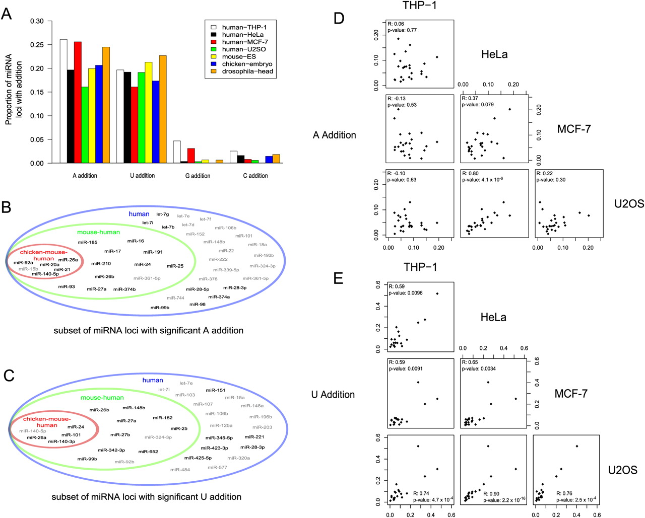 3′ miRNA addition across organisms. (A) Proportion of miRNA loci found to have single nucleotide unambiguous addition significantly greater than expected error rate (see Methods) across seven deep-sequenced short RNA libraries in four species. Sets of miRNA loci with adenine addition (B) and uridine addition (C) found to have significant amounts of addition in multiple vertebrate species. miRNA loci shaded in gray have significant addition in three of the four human cell lines; loci shaded in black have significant addition in all four human cell lines. Comparison of the proportion of unambiguous adenine (D) and uridine (E) addition for individual miRNA loci in the four human cell lines; Spearman's correlation and P-values are given in the corners of individual scatterplots.