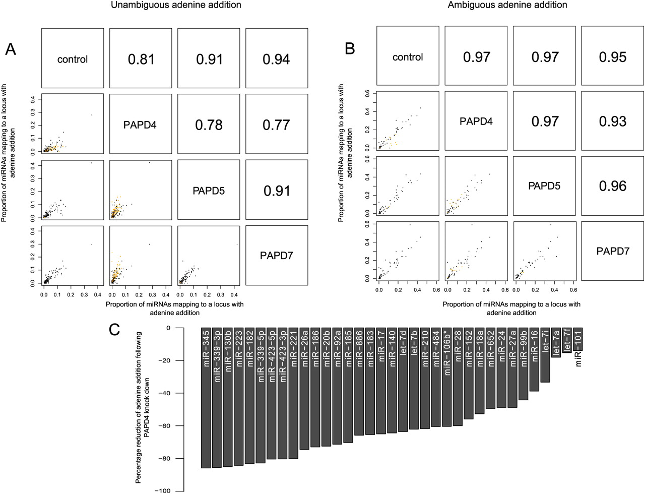 PAPD4 broadly affects adenine addition at THP-1 miRNA loci. Comparison of unambiguous adenine addition rates (A) and ambiguous adenine addition rates (B) across control and PAPD4, PAPD5, and PAPD7 knockdown short RNA libraries. Lower left panels plot the percentage of adenine addition at specific loci between libraries, which are labeled on the diagonal panels. Loci with <50 sequence tags in the control condition are excluded to reduce noise. Upper right panels give the Pearson's correlation between two libraries. Loci with significant decrease (Fisher's exact test, Bonferroni post hoc correction) in addition relative to control library are colored in orange. (C) Percentage of reduction in adenine addition at miRNA loci in the PAPD4 knockdown library relative to control library for miRNA loci which meet the following two requirements: (1) reduction relative to control library is significant, and (2) addition is significantly greater than the expected error rate of addition (see Methods).
