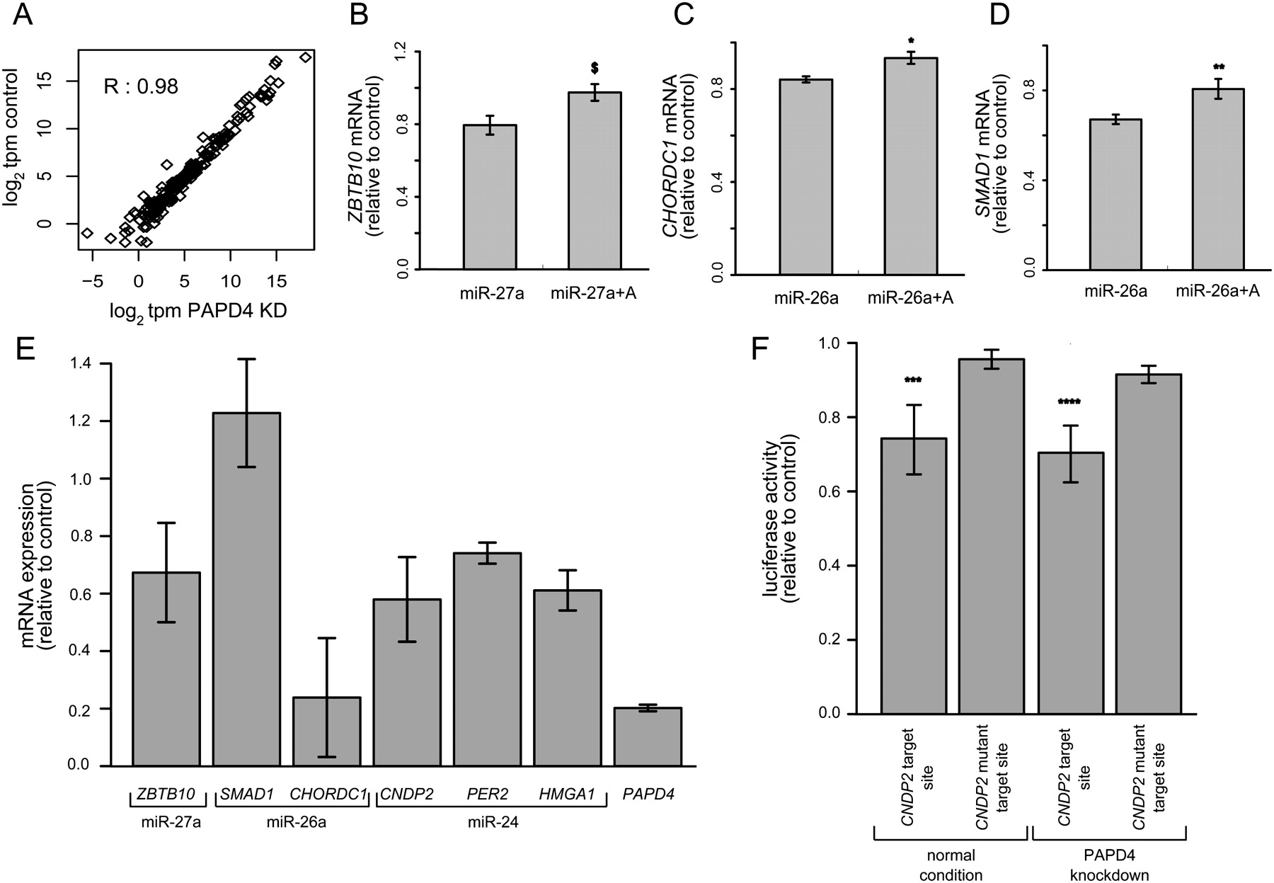 miRNA expression levels are unaffected by PAPD4 knockdown and 3′ miRNA adenine addition reduces mRNA target repression. (A) Total sequence tag counts mapping to all miRNA loci compared across the control and PAPD4 knockdown short RNA libraries. Tag counts are normalized into tags per million (tpm) and log2-transformed. Pearson's correlation is given in the upper left corner of the plot. (B–D) Targets of miRNA (B, ZBTB10; C, CHORDC1; D, SMAD1) are repressed after transfection of primary miRNA sequence (left) and repression is reduced after transfection of miRNA with 3′ adenine addition (right). Expression ratio is normalized to the endogenous GAPDH mRNA level, with average values bracketed by SEM error bars (Methods). While ZBT10 expression appears to be reduced, the change is not significant at a threshold P < 0.05. $P = 0.065 for miR-27a targeting of ZBTB10, *P = 0.030 for miR-26a targeting of CHORDC1, and **P = 0.028 for miR-26a targeting of SMAD1 (paired Students t-test, n = 3). (E) Expression levels of mRNA targets of different miRNA are generally decreased after knockdown of PAPD4. Each bar represents a distinct mRNA target, labeled on the x-axis along with the known miRNA that targets that gene. Expression ratio is normalized as in B–D, with n = 4. The expression level of PAPD4 during knockdown is provided as a reference in the far right bar of the plot. (F) Luciferase activity of reporter assay for wild-type and mutated miRNA target sequence of CNDP2 mRNA transcript. Luciferase activity is measured as described in Methods and tested in normal and PAPD4 knockdown conditions. ***P = 0.035 in normal condition and ****P = 0.015 in PAPD4 knockdown condition (paired Students t-test, n = 4).