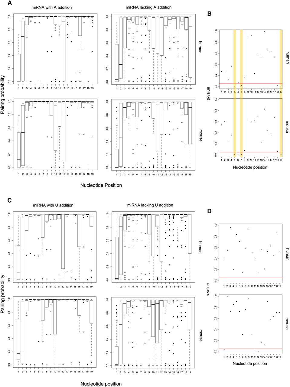 Pairing probability profiles for miRNA with and without 3′ addition events. (A) Boxplots depict the pairing probabilities, and by extension the double-stranded character, of individual nucleotide positions in miRNA at positions 1–19. Boxplots to the left depict the double-stranded character of the set of miRNA with significant unambiguous A addition conserved across human THP-1, human HeLa, and mouse embryonic stem cells. Boxplots to the right depict double-stranded character of the set of miRNA that never show significant addition across the same cell types. Plots to the top are constructed with the sequences of human miRNA; plots to the bottom are constructed with the sequences of mouse miRNA. (B) P-values of Wilcoxon rank sum test comparing pairing probabilities at nucleotide positions 1–19 across miRNA with addition and without addition are plotted. Red line plotted at P = 0.05, the level of significance. Positions with conserved significance across human and mouse miRNA are highlighted in yellow. (C,D) Same as A, B, but testing the set of miRNAs with conserved unambiguous uridine addition.