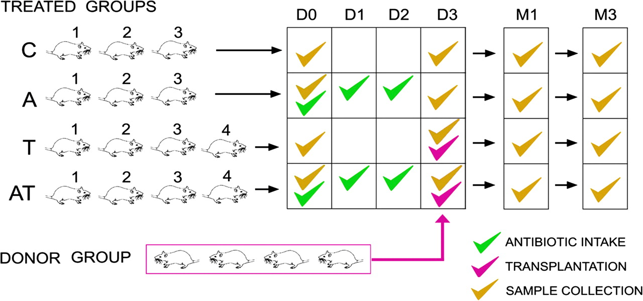Experimental design. Four groups of rats were used as recipients of different treatments: (C) controls; (A) ATB intake during 3 d; (T) transplantation; (AT) 3-d ATB intake followed by transplantation. The cecal content of four donor rats was pooled and transplanted to a recipient rat once by gavage. Fecal samples of all rats were collected at different time points, day 0 (D0), day 3 (D3), month 1 (M1), and month 3 (M3).