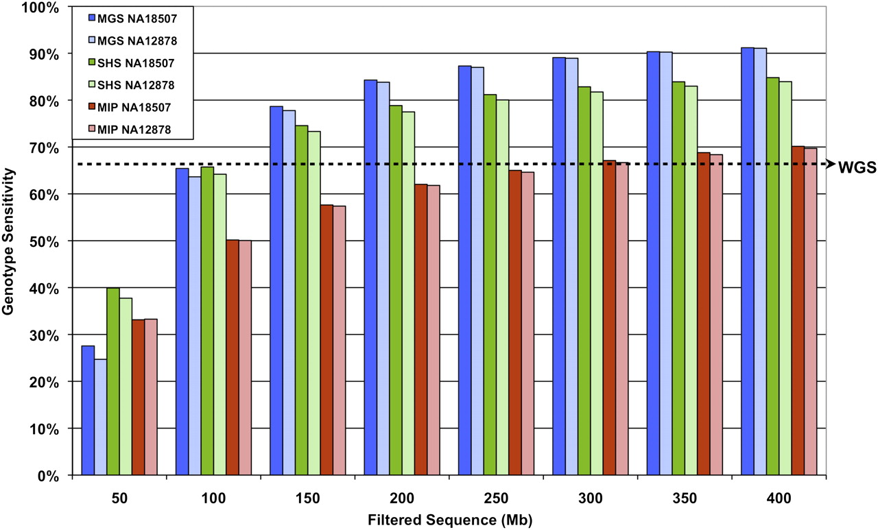Genotype sensitivity with increasing sequence data. Percentage of genotypes assigned in the ROI (same for all methods) with increasing filtered sequence data for NA18507 and NA12878. Sequence counts are based on 36 bases per read for MIP and SHS. To account for the 6-base index bar code, 42 bases were used in the sequence count calculations for MGS. The dashed arrow indicates genotype sensitivity level (67.3%) of 30-fold coverage whole-genome shotgun (WG) data for the ROI analyzed in this study.
