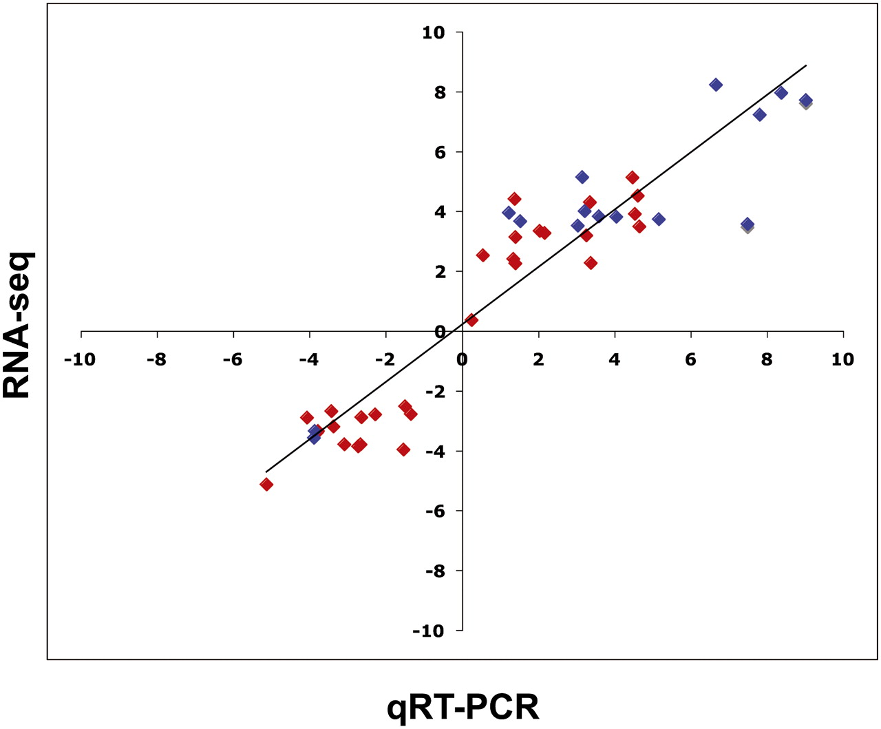 Verification of gene expression analysis by quantitative real-time PCR (qRT-PCR). Individual gene expression ratios (treated/untreated) were calculated using RPKM data generated by RNA-seq and plotted against calculations done for the same gene using qRT-PCR. Red diamonds represent novel transcripts. Blue diamonds represent annotated genes that were previously not known to be regulated under that particular condition. The Pearson correlation is 0.929.