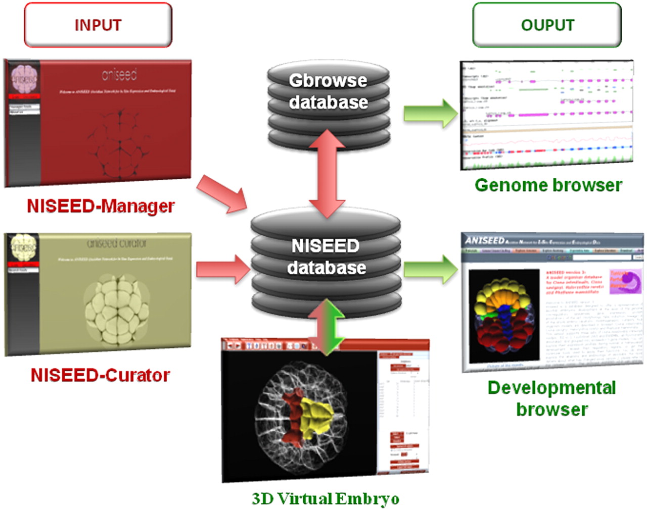 Overview of the architecture of the NISEED system. (Arrows) Direction of information flow. Supplemental Figures S1 and S2 present the search interfaces in more details.