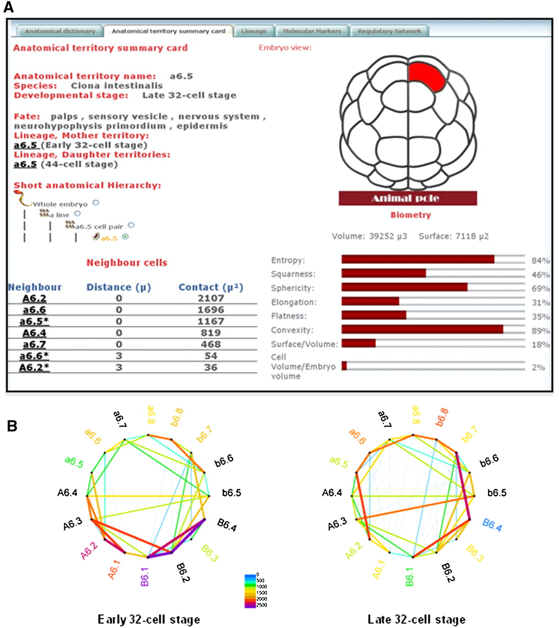 Representation of embryonic anatomy. (A) Screenshot of an anatomical territory card representing the lineage, fate, position/contacts with neighbors, and geometry of the a6.5 cell at the early 32-cell stage. Note the tabs at the top of the screen capture that lead to the whole anatomical ontology for the stage of interest (“Anatomical Ontology”), to the precursors and progeny of the territory of interest (“Lineage”), to expression profiles restricted to this territory (“Molecular Markers”), and to the regulatory interactions that take place in the lineage leading to this territory (“Regulatory Network”). (B) Neighborhood graph showing which cells of the late 32-cell embryo contact each other. The nodes of the graph represent individual cells, the edges represent contacts. The thickness of the edge reflects the area of contact between adjacent cells. The indicated values are in square microns. Supplemental Figures S3 and S4 give more details about the description of ascidian anatomy in ANISEED.