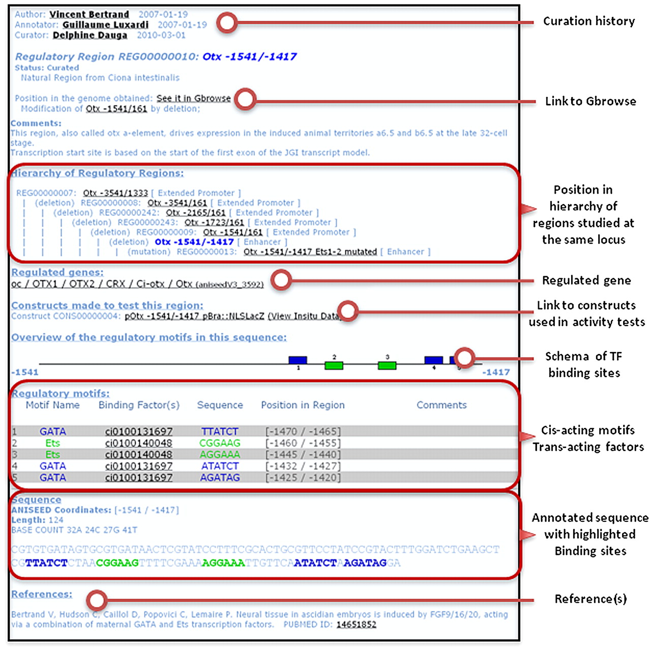 Representation of cis-regulatory information. Screenshot of the regulatory region card for the early minimal neural enhancer of Ciona intestinalis Otx. The precise pattern of activity of this region is accessed by clicking on the “view in situ data” link located in the “Constructs made to test this region” section. Supplemental Figure S6 presents the classification system for cis-regulatory regions used in ANISEED.