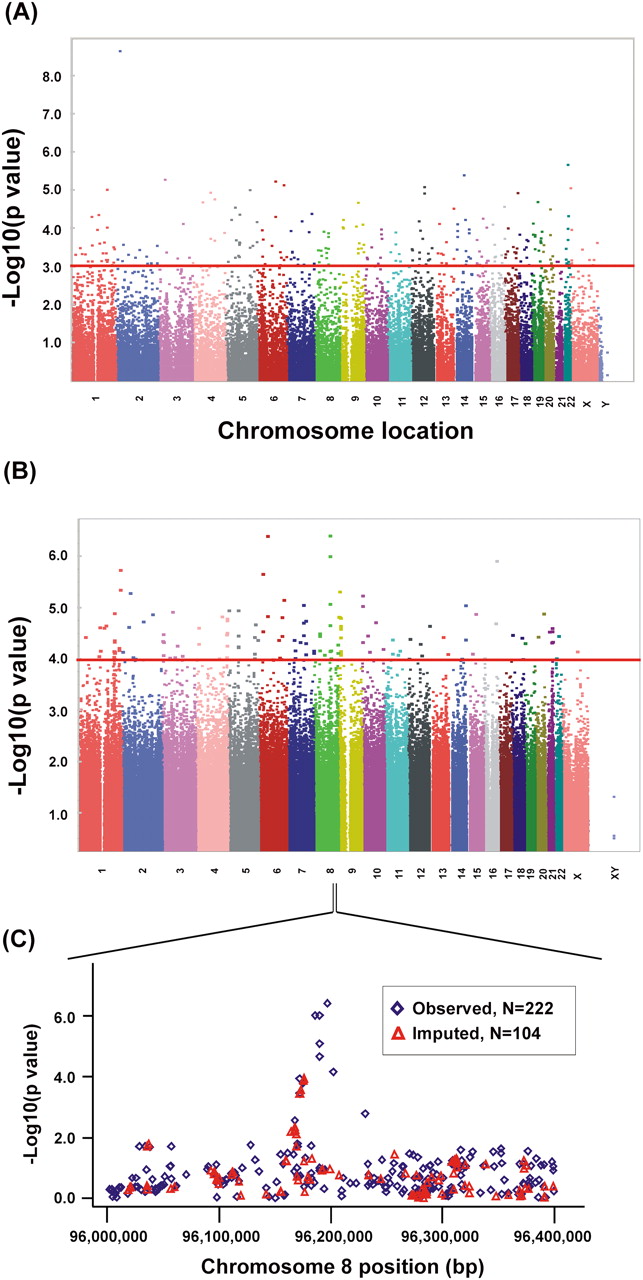 Genome-wide associations with radiation AUC. (A) Association of basal expression with radiation AUC for 277 cell lines. The y-axis represents the –log10(P-value) for the association of individual expression array probe sets. Expression probe sets are plotted on the x-axis based on the chromosomal locations of their genes. If genes had more than one probe set, the one with the lowest P-value was plotted. A P-value of 10−3 is highlighted with a red line. (B) Genome-wide SNP association with radiation AUC for 277 cell lines. The y-axis represents −log10(P-value) for the association of each SNP with radiation AUC. SNPs are plotted on the x-axis based on their chromosomal locations. A P-value of 10−4 is highlighted with a red line. (C) This panel shows the most significant locus on chromosome 8 that was associated with radiation AUC. Blue diamonds indicate SNPs observed by genotyping, while red triangles indicate imputed SNPs. The y-axis represents –log10(P-value) for the association of each SNP with radiation AUC, and the x-axis represents the location of the SNP on chromosome 8.