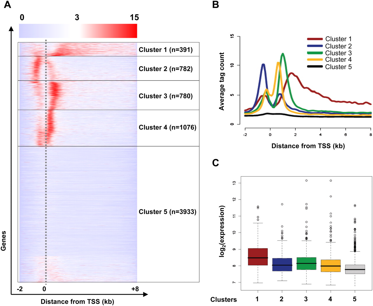 Clustering of H3K4me2 profiles reveals the presence of five main clusters. (A) K-means clustering of H3K4me2 profiles in regions from −2 to +8 kb around the TSS of a set of nonoverlapping genes. The Euclidean distance was used as a measure of similarity. Color scale indicates the level of enrichment. The number of genes within each cluster is indicated at the right of the panel (a list of all genes per cluster is provided in Supplemental Table 1). (B) Average profiles of H3K4me2 for genes within the five identified clusters. (C) Box plots showing the level of expression in CD4+ T cells of genes identified in the different H3K4me2 clusters.
