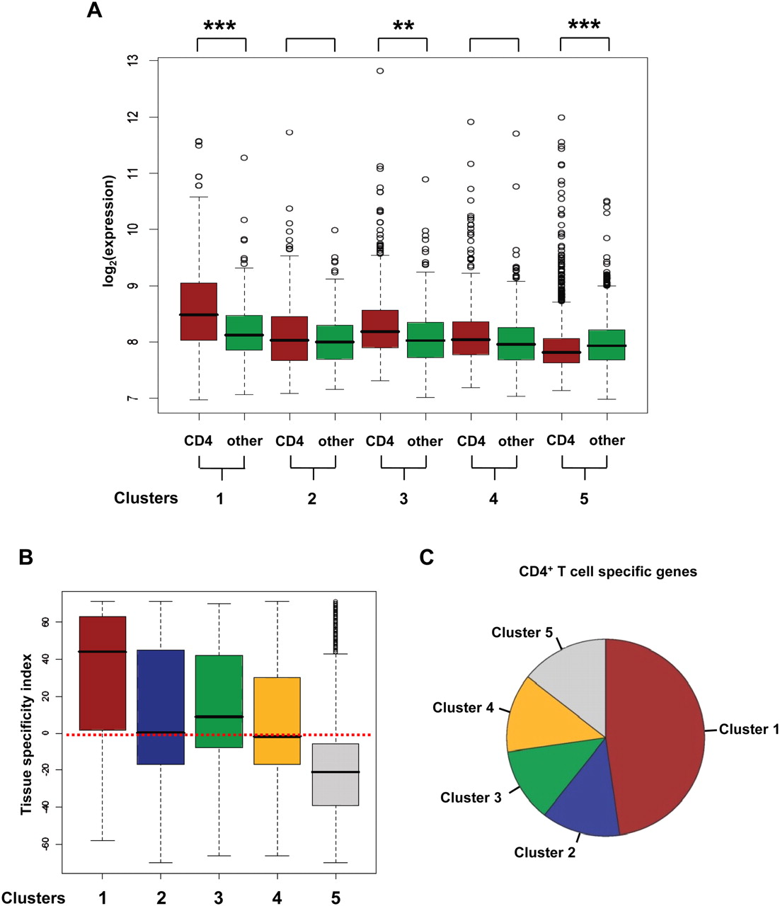 Genes within cluster 1 are preferentially expressed in CD4+ T cells. (A) Box plots showing the comparison between levels of gene expression from different H3K4me2 clusters in CD4+ T cells and the mean level of expression calculated across all other tissues (except CD4+ T cells; **P < 0.005, ***P < 0.0005, Mann-Whitney U test; other, other tissues). (B) Box plots showing per gene calculations of the net number of tissues per gene (i.e., T cell specificity index), for which a difference of expression (between a given tissue and CD4+ T cells) was statistically significant (Benjamini-Hochberg adjusted P < 0.05, moderated t-test). (C) Pie plot showing the distribution of CD4+ T-cell-specific genes within the five H3K4me2 clusters.