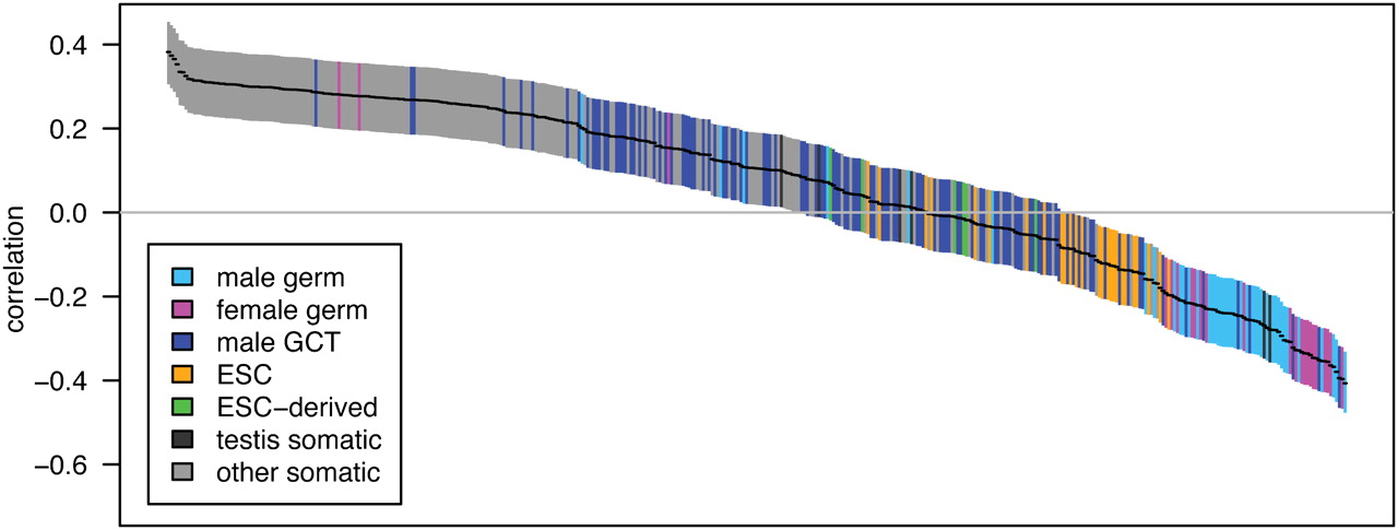 Pairwise correlations between gene expression and crossover rate for a set of genes with high tissue differentiation. Each of the 409 tissue samples is represented by a single bar, colored by tissue type as defined in the key (ESC, embryonic stem cells; GCT, germ cell tumors). Bars are ordered from left to right by the correlation coefficient, r, with the vertical extent of the bar indicating the 95% confidence interval. Only the 507 genes with at least 10 kb of sequence data and the highest tissue differentiation were included in this analysis, as these genes have more tissue-specific patterns of expression and provide the most power for discriminating between tissues; for correlations with the complete gene set see Supplemental Figure S1.