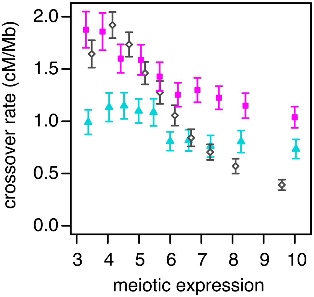 Crossover rate as a function of gene expression. Crossover rates for each gene are estimated from male (blue triangles) and female (pink squares) pedigree-based linkage maps or a fine-scale linkage-disequilibrium map (open diamonds). Genes are binned by their meiotic expression (into 10 bins of 1239 genes each); each point gives the mean crossover rate of the genes in a bin. Meiotic expression estimates are from fetal ovaries from 12–18 wk gestation (female map), spermatocytes (male map), or an average of the two (LD-based map). Only autosomal genes of at least 10 kb in length were used in this analysis. Error bars are 95% confidence intervals.