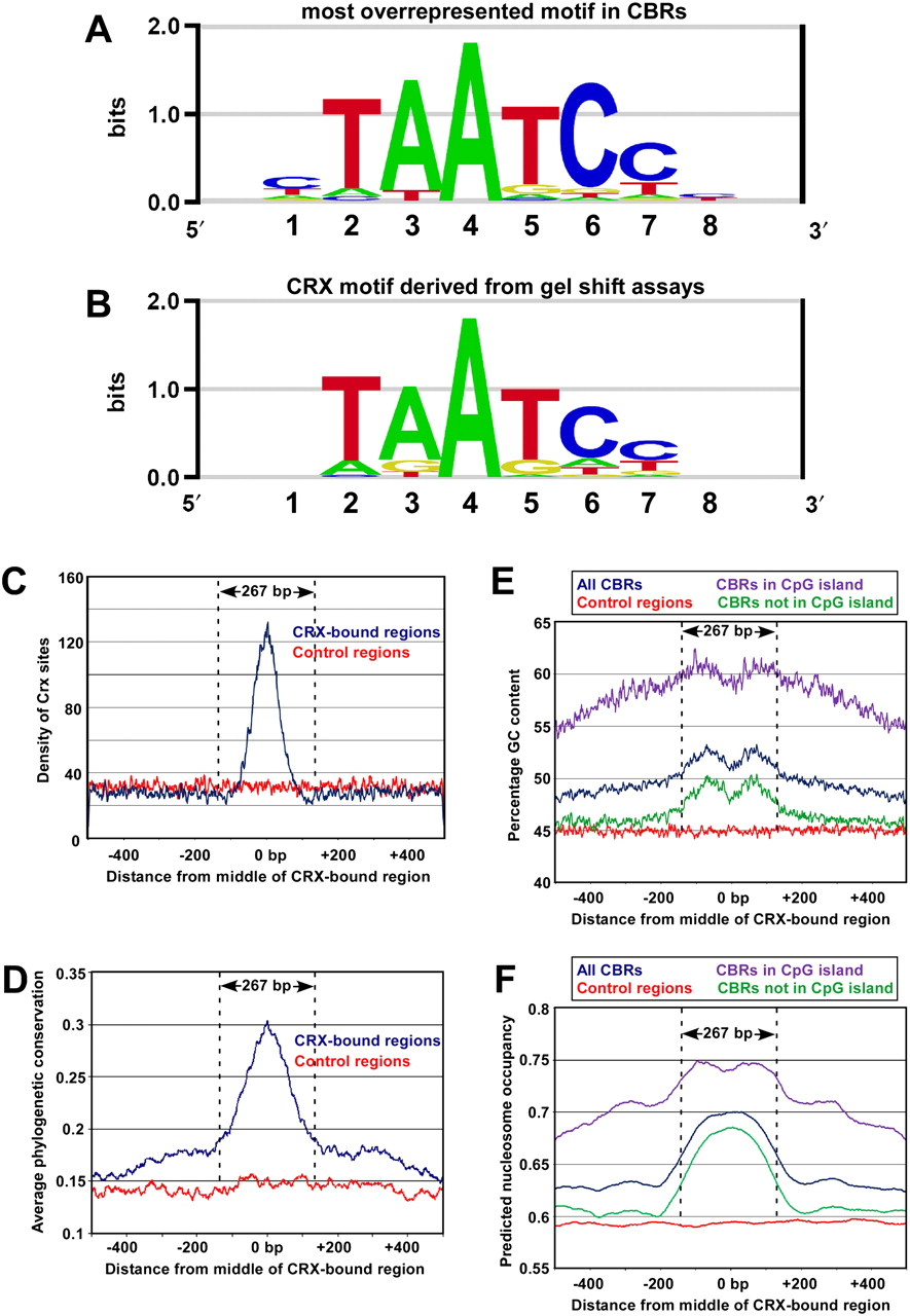 Sequence analysis of CRX-bound regions. (A) Sequence logo representing the single most highly overrepresented motif found in 10,212 CBRs derived from wild-type retina. (B) Sequence logo of the DNA-binding preference of in vitro synthesized CRX protein as determined by quantitative relative affinity gel shift assays (Lee et al. 2010). (C) The distribution of CRX binding sites across a 1-kb region centered on all replicated CBRs (blue curve) and a set of control sequences (red curve). The y-axis indicates the number of CRX sites per nucleotide that have an affinity ≥0.05 of the affinity of a consensus CRX site. The average size of the CBRs (267 bp) is indicated. (D) The average phylogenetic conservation across all replicated CBRs (blue curve) and a set of control sequences (red curve). The y-axis indicates the average phastCons score per nucleotide (Siepel et al. 2005). (E) Percentage GC content across all replicated CBRs (blue curve) and a set of control sequences (red curve). Also shown is the percentage GC content for all replicated CBRs that did (purple curve) or did not (green curve) overlap with CpG islands. (F) Predicted nucleosome occupancy based on a prior study (Kaplan et al. 2009), across all replicated CBRs (blue curve) and a set of control sequences (red curve). Also shown is the predicted nucleosome occupancy for all replicated CBRs that did (purple curve) or did not (green curve) overlap with CpG islands.