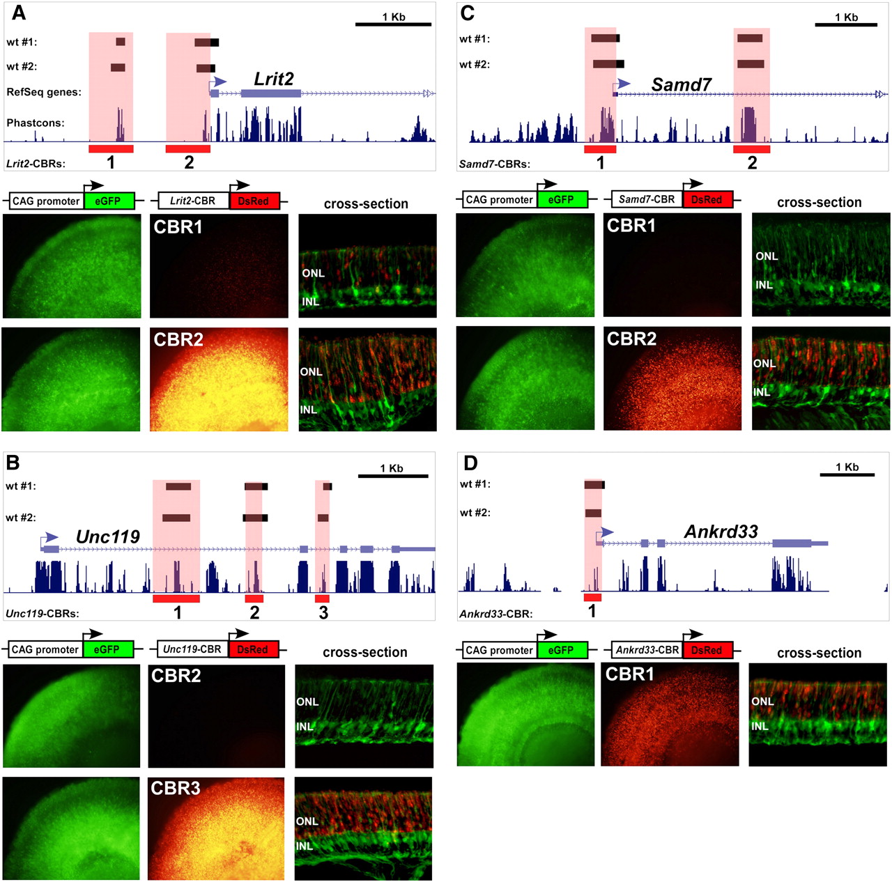CRX-bound regions are photoreceptor-specific cis-regulatory elements. (A) The CBRs around a novel photoreceptor-enriched gene, Lrit2, act as photoreceptor-specific cis-regulatory elements. There are two CBRs within the first 2 kb upstream of the transcription start site that were bound in both CRX ChIP-seq replicates from wild-type retinas (“wt #1” and “wt #2”). PCR products encompassing these CBRs (highlighted in light red) were cloned into a DsRed reporter construct and co-electroporated along with a ubiquitously expressing CAG promoter into explanted P0 mouse retinas. The retinas were grown for 8 d and then imaged in both red and green channels in flat-mount and as cross-sections. All flat-mount images in this figure were exposed for the same length of time to permit comparison of the strength of expression. (B) CBRs around a known photoreceptor gene, Unc119, which, when mutated in humans, results in cone-rod dystrophy. Unc119-CBR1 was shown previously to drive strong photoreceptor-specific expression in electroporated retinas (Hsiau et al. 2007). Unc119-CBR3 also drives strong photoreceptor expression, whereas Unc119-CBR2 does not. (C) CBRs around another novel photoreceptor-enriched gene, Samd7. Samd7-CBR2 drives strong, photoreceptor-specific expression, whereas Samd7-CBR1 does not. (D) CBR around a photoreceptor-enriched gene, Ankrd33, which has recently been shown to inhibit the DNA-binding activity of CRX (Sanuki et al. 2010). Only a single CBR was found in the vicinity of Ankrd33. It shows strong photoreceptor-specific cis-regulatory activity.