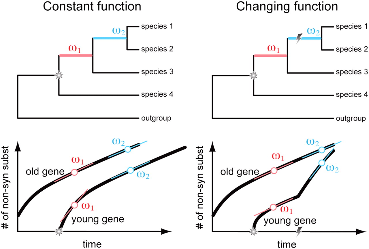 According to conceptual models of protein evolution, young genes experience more variable selection pressures over time than old genes. The two examples shown here illustrate a young gene that arose at the common ancestor of species 1–4 (stars), compared with an old gene that arose in the distant past. (Bottom) The cumulative number of nonsynonymous substitutions over time, the slope of which is proportional to the dN/dS value. If the young gene retains its original function (left), it rapidly depletes adaptive sites, resulting in a dramatic slowdown in the nonsynonymous substitution rate: ω2 < ω1. If the young gene experiences a functional change in a lineage (either relaxed constraint or neofunctionalization; right), as indicated by a lighting bolt, it rapidly accumulates nonsynonymous substitutions, resulting in ω2 > ω1. In both cases the young gene experiences variable selection pressures (i.e., large |ω1 – ω2|), whereas the old gene experiences roughly the same selection pressure in recent times, because it retains its function and most of its adaptive sites have already been depleted: ω2 ≈ ω1.