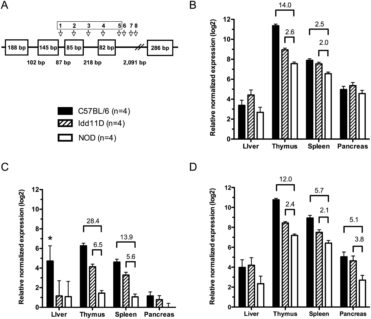 Schematic diagram and expression analysis of AK005651. (A) The Idd11 haplotype (variants 1–5) is located within a predicted gene, termed AK005651, consisting of five exons (Supplemental Table 5). Exon 3 is alternatively spliced giving rise to two different transcripts (±exon 3). Quantitative real-time PCR was performed to detect expression differences between mouse strains at 50 d of age for the spliced product derived from: (B) exons 4 and 5, which are present in both splice variants; (C) exons 2 and 3, (*) one of the four C57BL/6 samples was an extreme outlier (the mean relative normalized expression is 2.29 excluding this outlier); (D) exons 2 and 4. Approximate fold change (≥2) is shown only for significant pairwise comparisons between NOD and other mouse strains (P < 0.05, adjusted for multiple testing). Bars, mean expression level (±pooled SEM for each tissue).