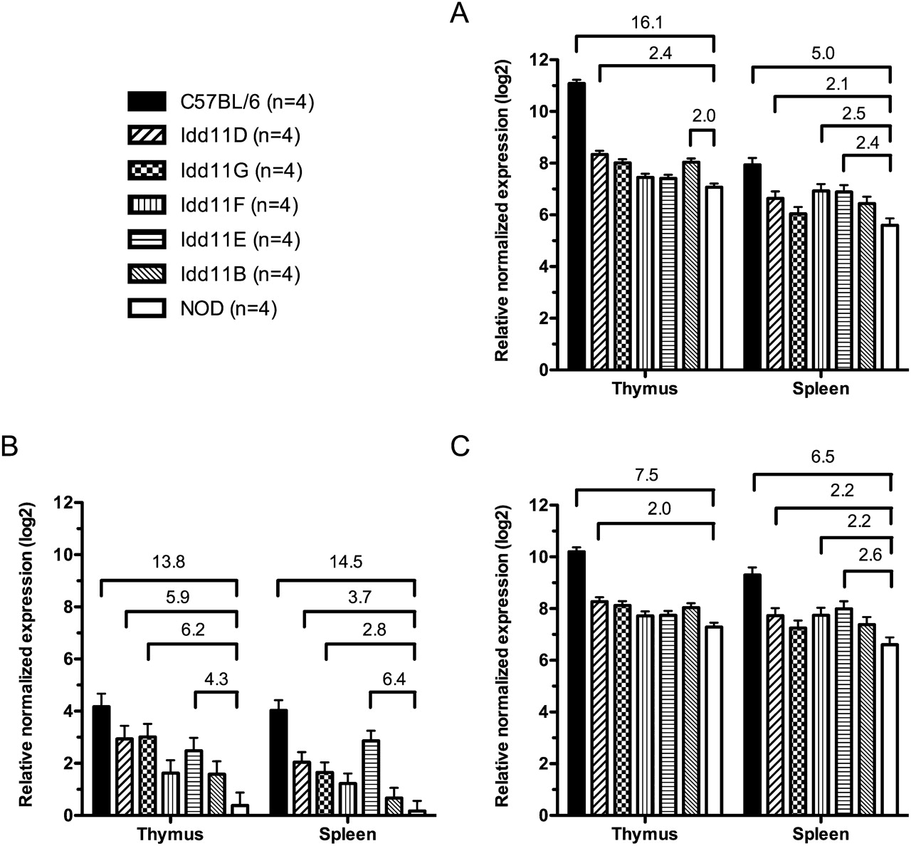 Expression analysis of AK005651 in congenic NOD mouse strains. Quantitative real-time PCR was performed to detect expression differences between mouse strains at 50 d of age for the spliced product derived from the following: (A) exons 4 and 5, which are present in both splice variants; (B) exons 2 and 3; (C) exons 2 and 4. Different cohorts of NOD, B6, and Idd11D mice to those in Figure 3 were generated and used in conjunction with Idd11B, Idd11E, Idd11F, and Idd11G mice for this experiment. Fold change (≥2) is shown only for significant pairwise comparisons between NOD and other mouse strains (P < 0.05, adjusted for multiple testing). Bars, mean expression level (±pooled SEM for each tissue).