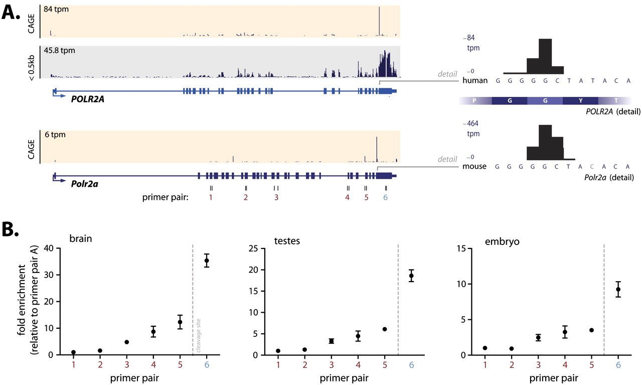 Detailed analysis of Polr2a cleavage. (A) Genome Browser view showing human (top panel) and mouse (bottom panel) Polr2a gene. Frequency distribution of CAGE tags (beige panels) indicates prevalent cleavage in the terminal Polr2a exon in both human and mouse (note that promoter CAGE tags are omitted). Nucleotide-level resolution of the Polr2a cleavage site (right panels) indicates conservation of the cleavage event between human and mouse. Size-fractionated RNA sequencing tags from human embryonic stem cells (gray panel) shows enriched expression immediately downstream from the cleavage event. (B) RT-PCR using primer pairs in mouse brain, testes, and embryo shows enriched expression downstream from the cleavage site. Positions of the RT-PCR primers (1–6) are indicated in A.