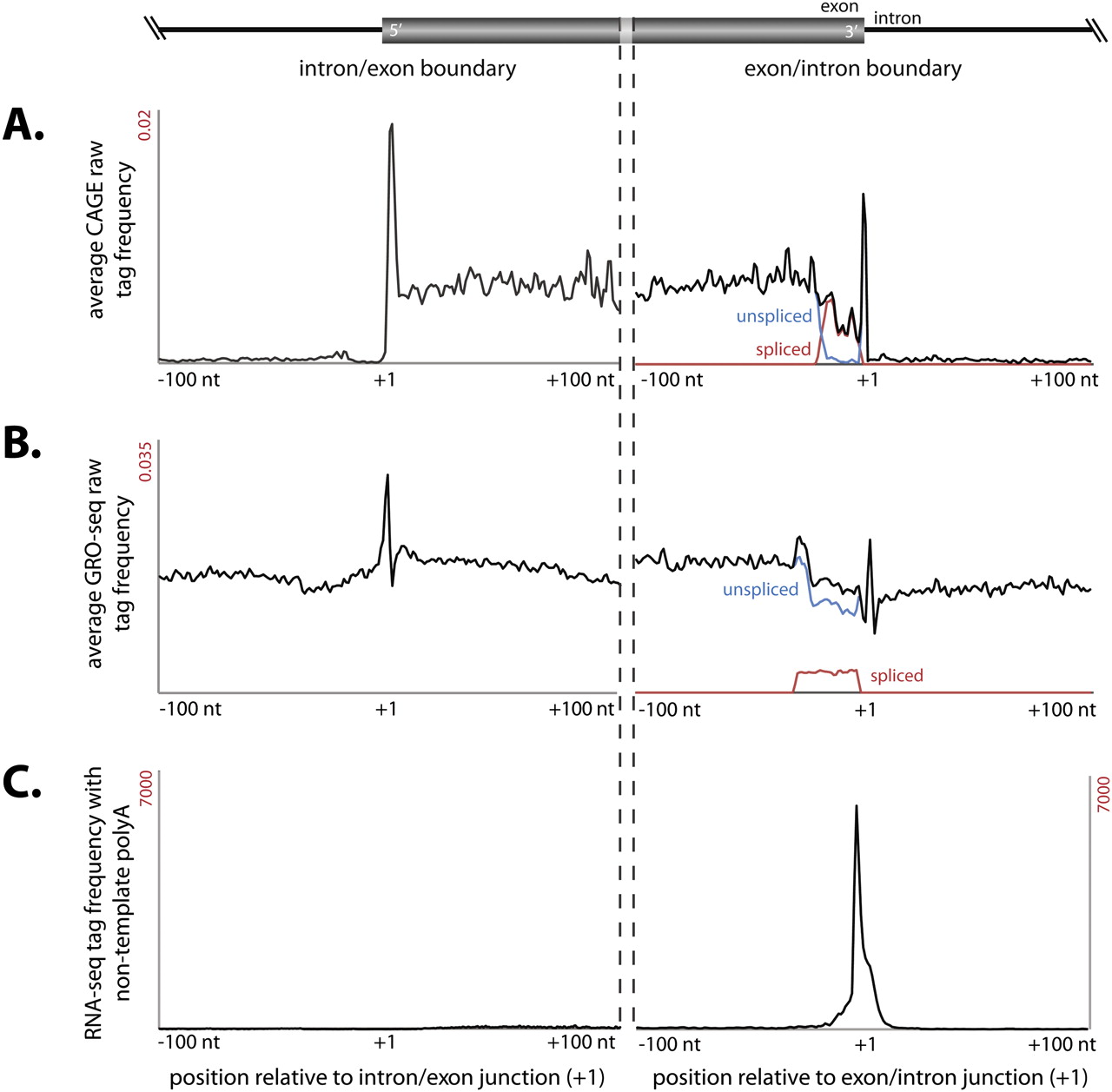 Distinct class of exonic CAGE tags associated with splice junctions. (A) Average CAGE tags frequency distribution within a 200-nt window centered on splice junctions (indicated at +1) shows a distinct enriched peak immediately downstream from the intron–exon junction (first column) and exon–intron junction (second column). (B) Distribution of GRO-seq tags derived from nuclear run-on (Core et al. 2008) across splice junctions peak immediately downstream from the intron–exon junction and exon–intron junction. (C) Cumulative frequency distribution of polyadenylated RNA deep-sequencing tags from mouse brain (Parkhomchuk et al. 2009) across exon–intron splice junctions.