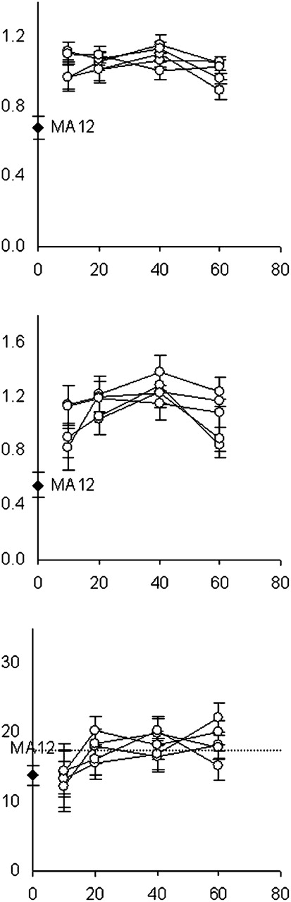 Fitness trajectories of individual C. elegans recovery lines. Black diamonds at generation 0 show average fitness trait values for the MA12 ancestor. Open circles represent average trait values for each of the five lines initiated from the MA12 genotype and evolved independently for 60 generations. Lines connect the same evolved populations across generations. Intrinsic rate of population increase (top panel), r (Giannelli et al. 1999), and total fecundity (middle panel) are reported as the proportion of N2 control values. The bottom panel shows lifespan; dashed line represents average lifespan of the N2 control. Bars, 1 SEM.