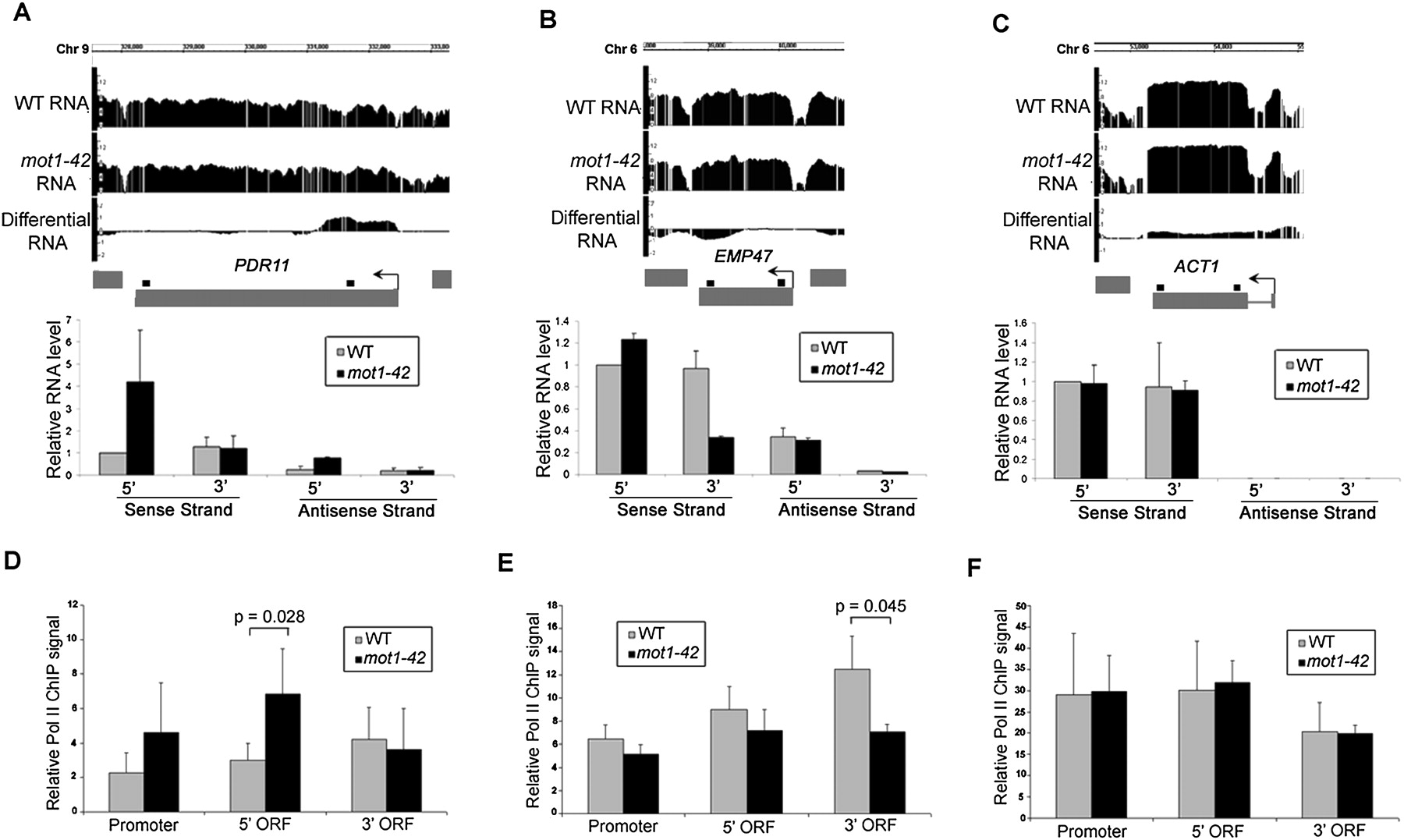 Validation of premature termination RNA length changes in mot1-42 cells and correlation with Pol II density. (A–C, top) Screen shots showing log2 WT, mot1-42, and differential RNA signals across PDR11, EMP47, and ACT1 genes. (Bottom) Relative RNA levels were quantified by real-time PCR for both the sense and antisense strands. Primers were specific for either the 5′ or 3′ end of each gene, and the amplified product is represented by the small black square above each gene. Results shown are from the means of two independent RNA samples with associated SE. PDR11 is an example of a gene with increased 5′ transcription in mot1-42 cells (classified as differentially up), whereas EMP47 had similar levels of 5′ RNA but less 3′ RNA in mot1-42 versus WT cells (classified as differentially down). No RNA length change was detected for ACT1, and the change in RNA level across the open reading frame was small (≤5%) in comparison to the total level of total ACT1 RNA in both strains. Antisense ACT1 RNA was not detectable. (D–F) Relative Pol II ChIP signals in the promoter, 5′ end, and 3′ end of each ORF. The results were obtained using the 8WG16 antibody and are shown as the mean of three independent biological replicates ± SD. The indicated P-values were determined using a one-tailed paired t-test of the log-transformed ChIP values. Note the correspondence between the changes in Pol II ChIP and RNA length changes: The 5′ ORF of PDR11 had an increased level of Pol II in mot1-42 cells that corresponded with increased 5′ ORF RNA level. Similarly, Pol II ChIP signal was decreased in the 3′ ORF of EMP47, consistent with the decrease in 3′ RNA in mot1-42 cells. As expected, there were no significant changes in Pol II ChIP for ACT1.