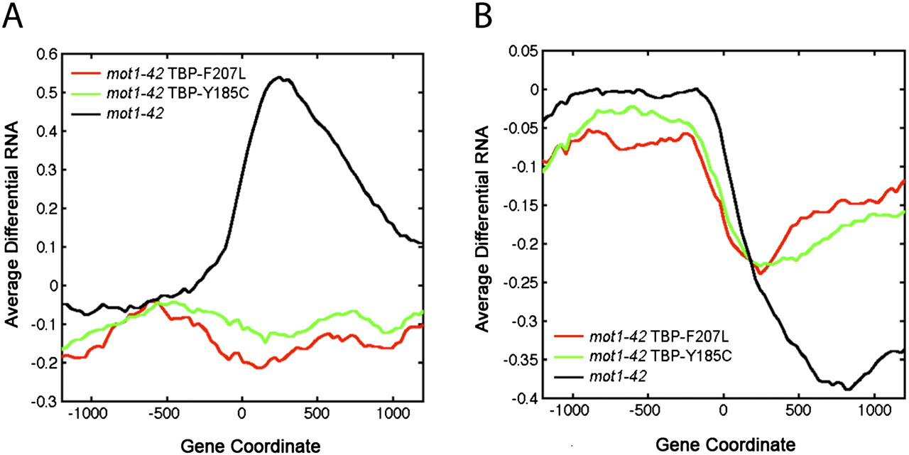 Suppression of the premature termination defects in mot1 cells by mutations in TBP. (A,B) Profiles of average differential RNA—defined as the average of the differential RNA signal as determined in Supplemental Methods (RNA Tiling Array Data)—for genes showing premature termination length changes in mot1-42 versus WT cells (black lines). The x-axis indicates the position along the chromosome in base pairs relative to the start of the gene annotation (zero). For comparison, the plots show the average differential RNA profiles for these same genes in mot1-42 cells harboring TBP-F207L versus WT (red lines) and mot1-42 TBP-Y185C versus WT (green lines). Premature termination length effects were subclassified depending on whether the differential signal was positive (A, 77 genes) or negative (B, 264 genes). Average signals were obtained by smoothing over a 30-bp window.