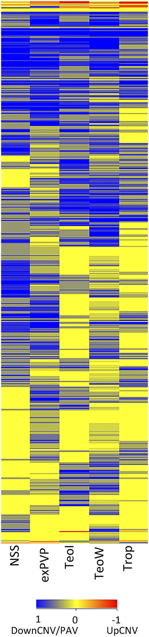 Structural variation haplotype frequencies in subpopulations of maize. Each of the genotypes was assigned to a subpopulation based on pedigree information or structure analysis. The subpopulations are nonstiff stalk (NSS, n = 4), ex-plant varietal protection varieties (exPVP, n = 6), inbred teosinte (TeoI, n = 4), wild teosinte (TeoW, n = 10), or tropical (Trop, n = 5). The frequency of the structural variant within this subpopulation was used to perform hierarchical clustering of both the structural variants and the subpopulations. The color indicates the type and frequency of each structural variant, with blue indicating DownCNV/PAV and red indicating UpCNV. The brighter colors represent higher allele frequencies.