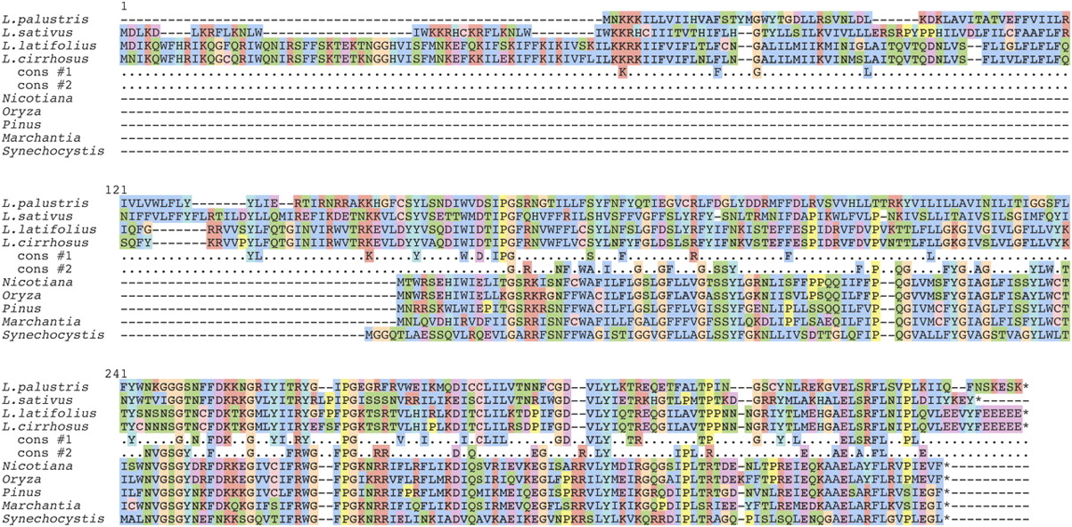 Alignments of Ycf4 protein sequences from four Lathyrus species, four diverse land plants, and the cyanobacterium Synechocystis. Cons #1 shows residues that are absolutely conserved among the four Lathyrus species. Cons #2 shows residues that are absolutely conserved among Nicotiana tabacum, Oryza sativa, Pinus thunbergii, Marchantia polymorpha, and Synechocystis species PCC 6803. The alignment was made using MUSCLE as implemented in SeaView (Gouy et al. 2010) with default coloring of conservative amino acid substitution groups.