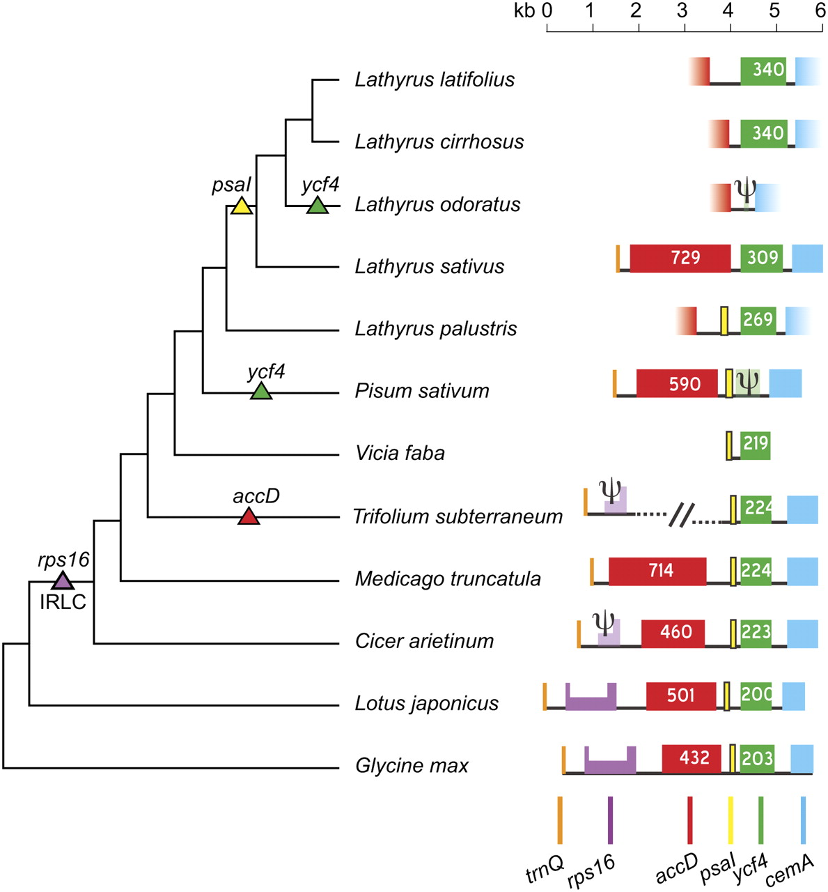 Gene organization around the ycf4 locus in some legumes. Triangles indicate evolutionary losses of the indicated genes. Numbers indicate the numbers of codons in accD and ycf4 genes. Psi symbols denote pseudogenes. All genes are transcribed from left to right. Fading colors denote genes that were not completely sequenced. The half-height region in rps16 represents an intron. The slash marks indicate a genomic rearrangement in T. subterraneum (Cai et al. 2008). The topology of the phylogenetic tree (not drawn to scale) is from Asmussen and Liston (1998), Wojciechowski et al. (2004), and Kenicer et al. (2005).