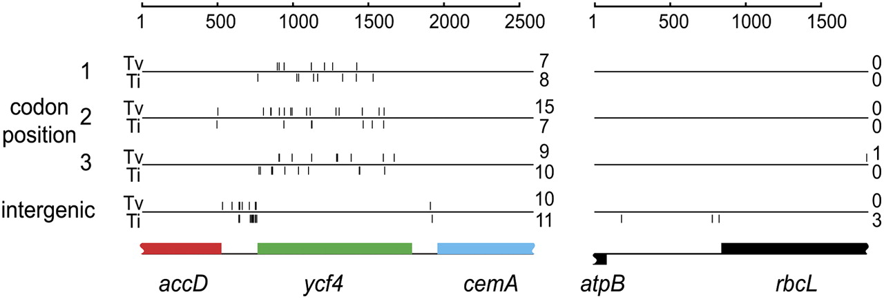 Sequence divergence between L. latifolius and L. cirrhosus in the accD-ycf4-cemA region (left) and the atpB-rbcL region (right). Vertical tickmarks indicate the locations of each nucleotide substitution, categorized according to whether it occurs at codon position 1, 2, or 3; or in intergenic DNA; and as a transversion (Tv; tickmarks above the horizontal lines) or a transition (Ti; tickmarks below the horizontal line). The total numbers of each type of substitution are shown on the right. Supplemental Figure S5 shows the nucleotide sequence alignment summarized in the left panel.