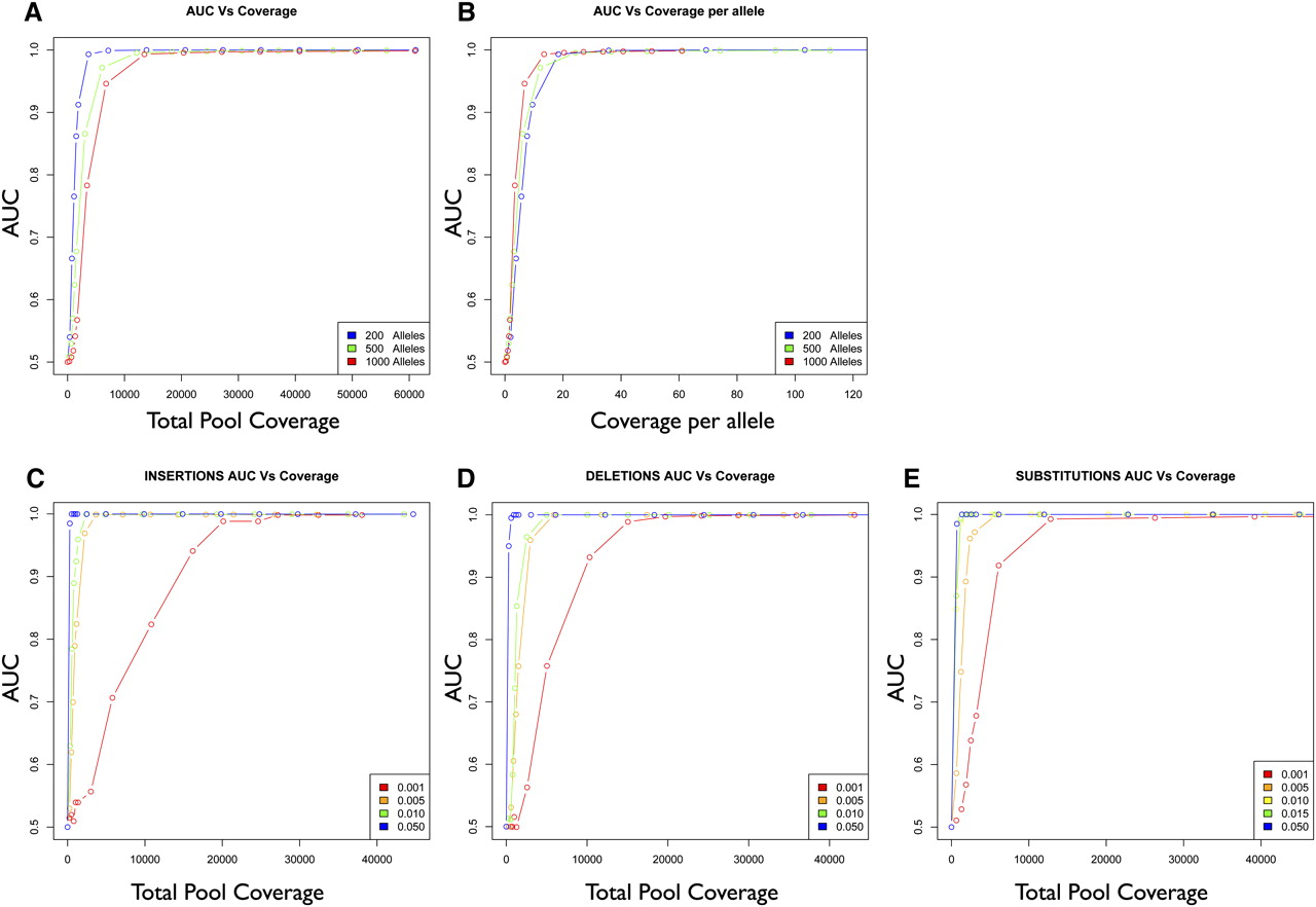 Relationship between variant detection accuracy and average sequencing coverage per base. (A) Accuracy expressed as AUC (area under the curve) (y-axis) plotted as a function of average sequencing coverage per base (x-axis) for synthetic pools with variants present at frequencies 1/200, 1/500, and 1/1000. (B) Same as in A, with average sequencing coverage per base per allele on the x-axis. (C–E) AUC (y-axis) as a function of average sequencing coverage per base (x-axis) for insertions (C), deletions (D), and substitutions (E). Variants are present at frequencies 1/1000, 5/1000, 10/1000, 15/1000, and 50/1000.