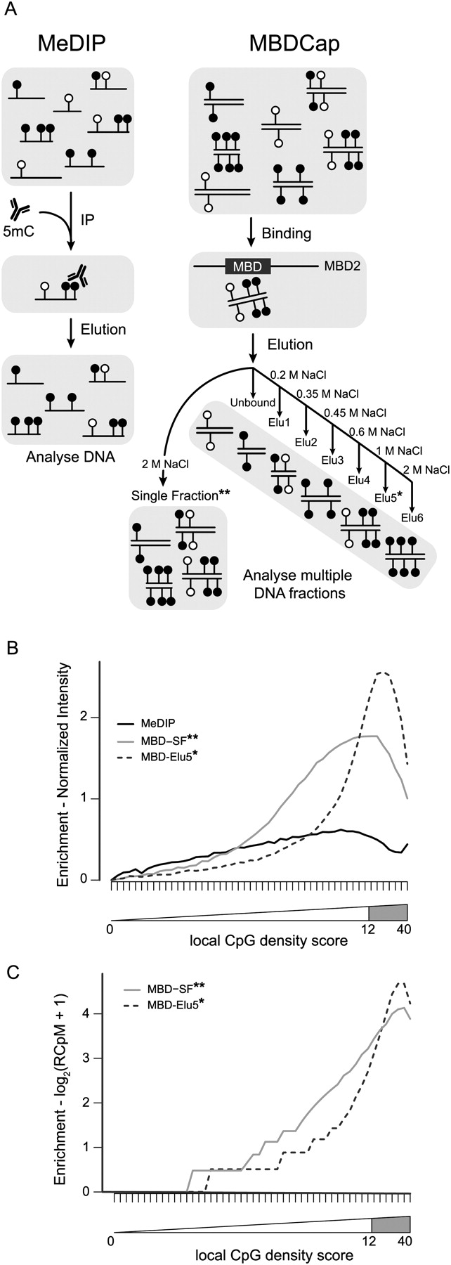 (A) Schematic showing the capture of methylated DNA into populations of single-stranded (MeDIP) or double-stranded (MBDCap) fragments. (B) Summarized probe intensities for enrichment of fully methylated DNA with MeDIP and two variations of MethylMiner-based enrichment. X-axis shows the local CpG density group (1–50). Y-axis shows the log2-scale input-normalized intensity. Each line shows the median intensity for the input-normalized intensities for the probes in the bin (here, for probes with GC content of 11 only). The intensities are further normalized such that the median in the lowest bin is 0. The location of probes within CpG islands is shown by the gray-shaded region, corresponding to a local CpG density score between 12 and 40. (C) Summarized read counts in bins of 1000 bases over the same genomic regions interrogated by the Affymetrix Promoter 1.0R array. Each line represents the median log2 read count (RCpM indicates read counts per million mapped); the summaries are normalized such that the median with the lowest bin is 0.