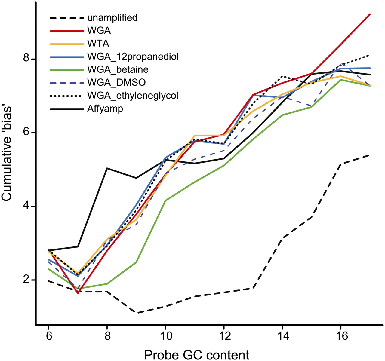 Observed cumulative bias of various amplification methods. X-axis denotes the probe GC content. Y-axis denotes the cumulative bias score, which captures the cumulative signal attenuation over the 50 bins of local CpG density (for definition, see Methods). Each line represents a different amplification strategy.