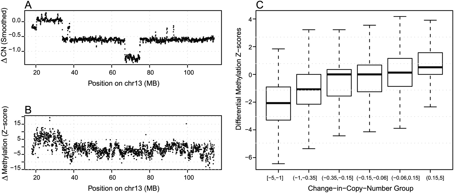 Effects of copy number changes on differential methylation detection. (A) Differential methylation Z-score for between LNCaP and PrEC cells, using MBD-SF-seq, for human chromosome 13. (B) Smoothed Affymetrix SNP 6.0 array data showing corresponding changes in copy number. (C) Genome-wide distributions of Z-scores, stratified by the change-in-copy-number status of the corresponding regions.