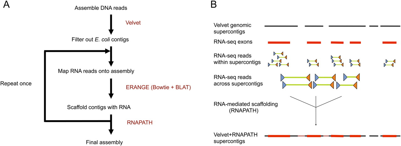 Sequencing strategy. (A) Genomic reads are assembled using the Velvet short read assembler and then filtered for high similarity to E. coli. RNA-seq paired reads are mapped using a combination of Bowtie and BLAT onto this preliminary genomic assembly. The RNA-seq reads are then imported into ERANGE, where those reads with ends on separate supercontigs serve as input to the RNAPATH module. This process can be repeated with trimmed reads to increase mappable reads, if necessary. (B) Paired RNA reads (each pair represented by a blue and an orange triangle connected by a green line), where each read end maps to a separate genomic supercontig, can be used to scaffold (i.e., to join, order, and orient) those genomic supercontigs based on the two read ends pointing toward each other.
