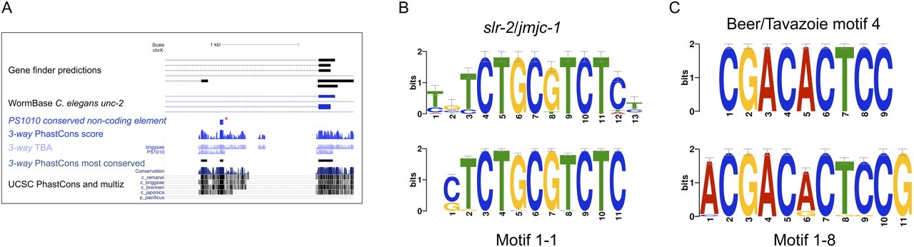 Conserved noncoding elements. (A) A highly conserved noncoding element (red star) in an intron of unc-2, as identified by phastCons and passing all of our filters, is a possible promoter element. Conserved PS1010 elements are typically subsets of the conserved elements shared between Elegans group genomes. (B) The most statistically significant predicted motif from the highly conserved noncoding elements (motif 1-1) (Table 2) is equivalent to the slr-2/jmjc-1-responsive motif of Kirienko and Fay (2010). (C) A functionally uncharacterized motif (1-8) closely resembles motif 4 of Beer and Tavazoie (2004).