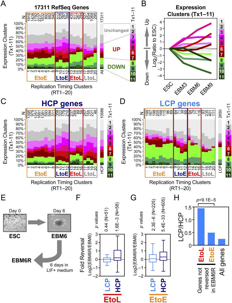Relationship between replication-timing changes, transcription changes, and their reversibility (A) Cross-tabulation of K-means clusters of replication timing and transcription. All 17,311 RefSeq genes present on the gene expression array were analyzed. Each of the 20 replication-timing clusters, RT1–20 (Fig. 2F), were presented as a stacked bar consisting of the 11 expression clusters, Tx1–11 (Fig. 1C). N, number of genes in RT1–20. (B) Line chart showing the kinetics of transcription changes of Tx1–11 during differentiation. Log2 transformed ratios to ESC levels are plotted. (C,D) The same cross-tabulation graph as in A, for 10,586 HCP genes (C) and 2650 LCP genes (D). HCP and LCP classification is based on Mikkelsen et al. (2007). (E) A scheme for the reversal of differentiation. EBM6R is a condition in which EBM6 cells were placed back into ESC medium containing LIF and cultured for 6 d. (F,G) Box plots showing the reversibility of different classes of genes. Log2 transformed expression level in EBM6R relative to EBM6 is plotted. Twofold down-regulated genes during the ESC–EBM6 transition were selected from the down-regulated expression clusters, Tx8–11. Among them, genes in the EtoL clusters (RT13–16) are presented in F, while genes in the EtoE clusters (RT1–8) are presented in G. P-values were obtained from a two-tailed t-test for comparison of two paired groups (i.e., EBM6R vs. EBM6). (H) LCP is overrepresented in EtoL genes that are not reversed in EBM6R. Twofold down-regulated EtoL and EtoE genes that did not show reversal (i.e., EBM6R/EBM6 < 1) were calculated for their LCP-to-HCP ratio. Note that there are four times as many HCPs as LCPs in the genome (=All genes). Numbers of genes in each category are 49 (EtoL) and 313 (EtoE). A P-value was obtained from a χ2 test.