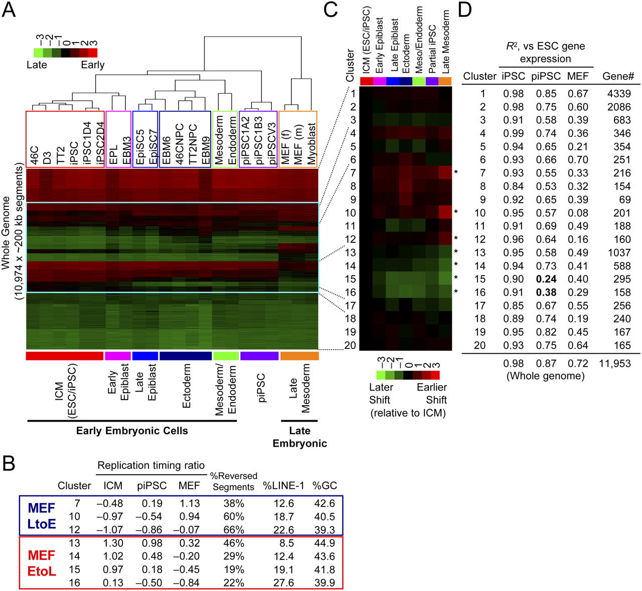 Lineage-independent early-to-late replication-timing changes are difficult to reprogram. (A) Hierarchical clustering of 22 cell lines, with the addition of piPSCs (1A2, 1B3, V3) and iPSCs (1D4, 2D4) (Maherali et al. 2007), using K-means clusters 4–17 defined in Figure 6A (framed in blue). (B) Properties of seven K-means clusters (identical clusters as in Fig. 6A–C) that showed large differential (>0.95) between MEFs and ICM. The fifth column (% Reversed Segments) shows the difficulty of regaining ESC-specific replication timing in piPSCs derived from MEFs. The numbers represent the percentage of 200-kb segments that showed more than 75% recovery in replication timing in piPSCs. (C) Average replication-timing differential of K-means clusters 1–20 relative to ICM in a heatmap format (identical clusters as in Fig. 6A–C). Here, red and green represent earlier and later shifts, respectively. (Asterisks) Clusters analyzed in B. (D) Pearson's R2-values for pairwise comparisons of gene expression in iPSCs, piPSCs, and MEFs to ESCs within each of the 20 clusters. At the bottom of the table is the whole genome comparison. Note that clusters 15 and 16 deviate considerably from the rest of the genome when piPSCs and ESCs are compared, indicating that gene expression program in these clusters is particularly resistant to reprogramming, in contrast to other clusters and the whole genome comparison. Gene expression levels are based on the work of Sridharan et al. (2009) (Supplemental Table 2).