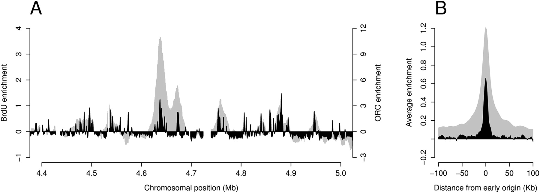 ORC localizes to specific chromosomal locations. (A) A subset of ORC binding sites map to early origins of replication. (Black) MA2C-normalized log2 ratios of ORC2 enrichment from chromatin immunoprecipitations are plotted as a function of chromosomal position for a 600-kb window of chromosome 3R. (Gray) Early origins were identified by immunoprecipitation of BrdU-containing replication intermediates during an HU arrest. (B) ORC is enriched at early origins of replication. The summits of 630 HU-resistant early origins were determined, and the average BrdU (gray) or ORC (black) enrichment is plotted relative to the distance from the early origin summit.