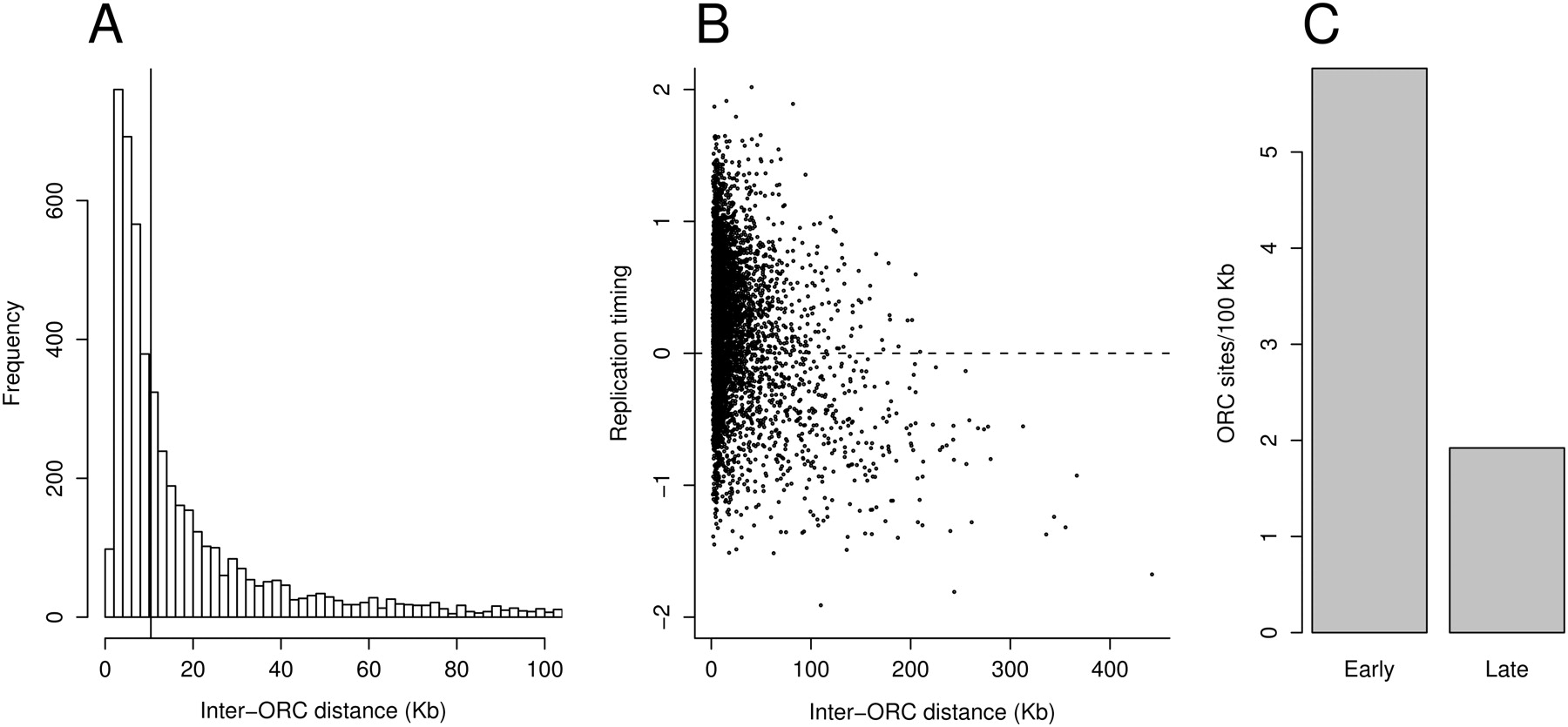 Chromosomal density of ORC is a determinant of replication timing. (A) A histogram of inter-ORC distance throughout the genome. The median distance between ORC binding sites is 11 kb. (B) Time of replication is significantly delayed for sequences between distant ORC binding sites. The relative time of replication for the sequences equidistant from two ORC binding sites was plotted against the distance between the two ORC binding sites. (C) Early-replicating regions of the chromosome have an increased density of ORC binding. ORC binding sites per 100 kb were determined for the earliest and latest quartile of replication timing domains.