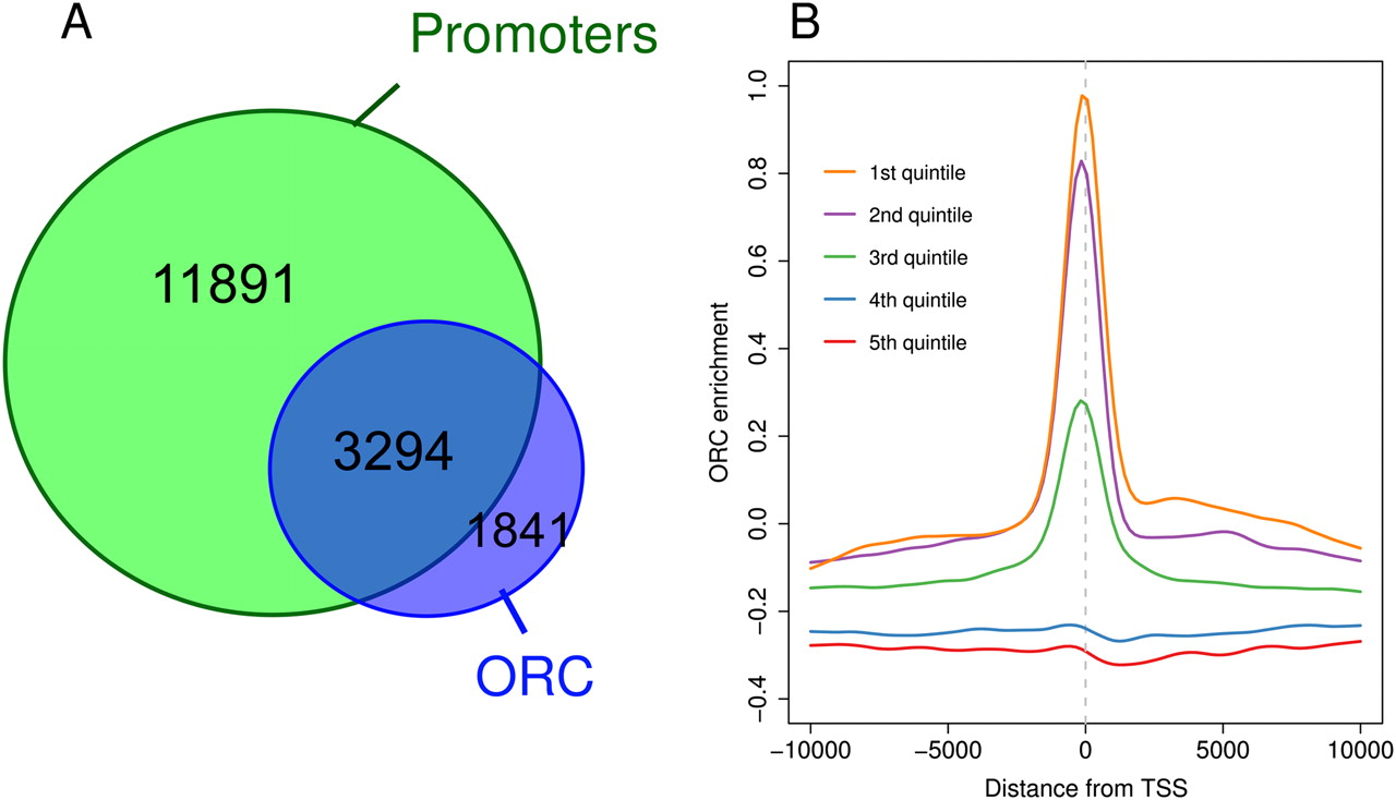 ORC associates with promoters of active genes. (A) Venn diagram depicting the overlap between ORC-associated sequences and annotated transcription start sites. (B) ORC localizes to the promoter regions of actively transcribed genes. The mRNA expression levels for approximately 15,000 Drosophila transcripts were determined by Affymetrix expression analysis. The mRNA expression levels for each gene were binned into five equal quintiles (Supplemental Fig. 2). The average ORC enrichment for each quintile of expression is plotted relative to the transcription start site.
