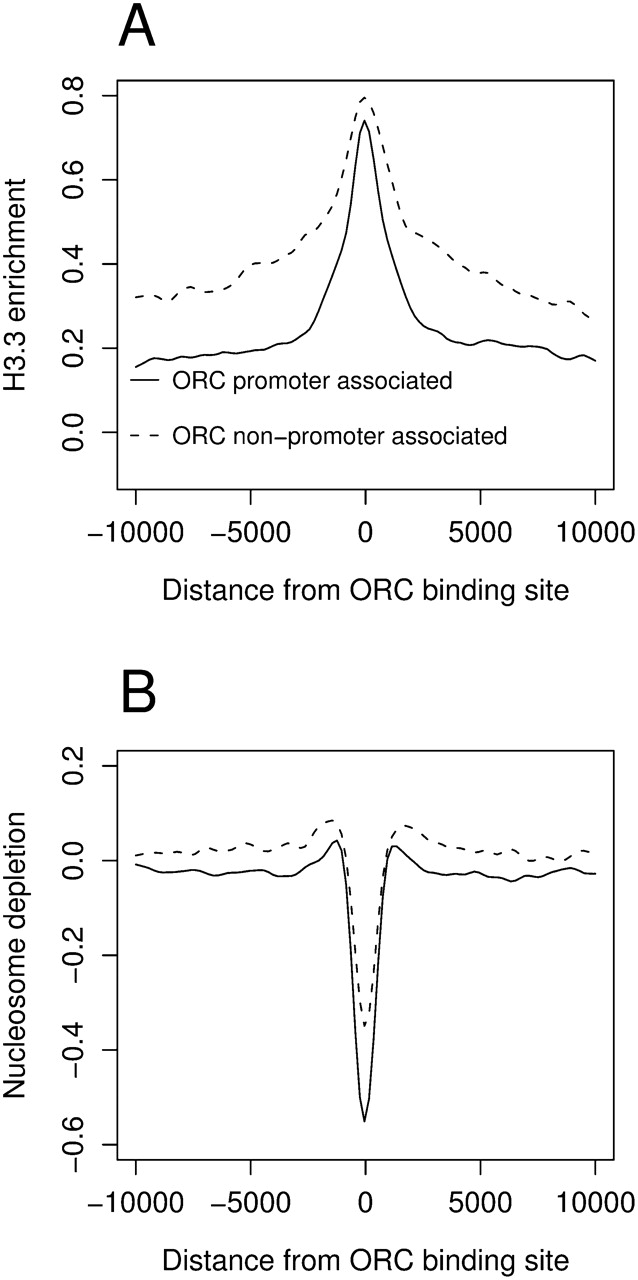 ORC localizes to open dynamic chromatin. (A) ORC binding sites are enriched for the histone variant H3.3. The average enrichment of H3.3 was plotted relative to the position of all ORC binding sites. The ORC binding sites were classified as either proximal or distal to annotated transcription start sites. Proximal ORC binding sites directly overlap with annotated promoters. (B) ORC binding sites are depleted for nucleosomes. The average depletion of nucleosomes was plotted relative to the position of promoter-proximal or -distal ORC binding sites.