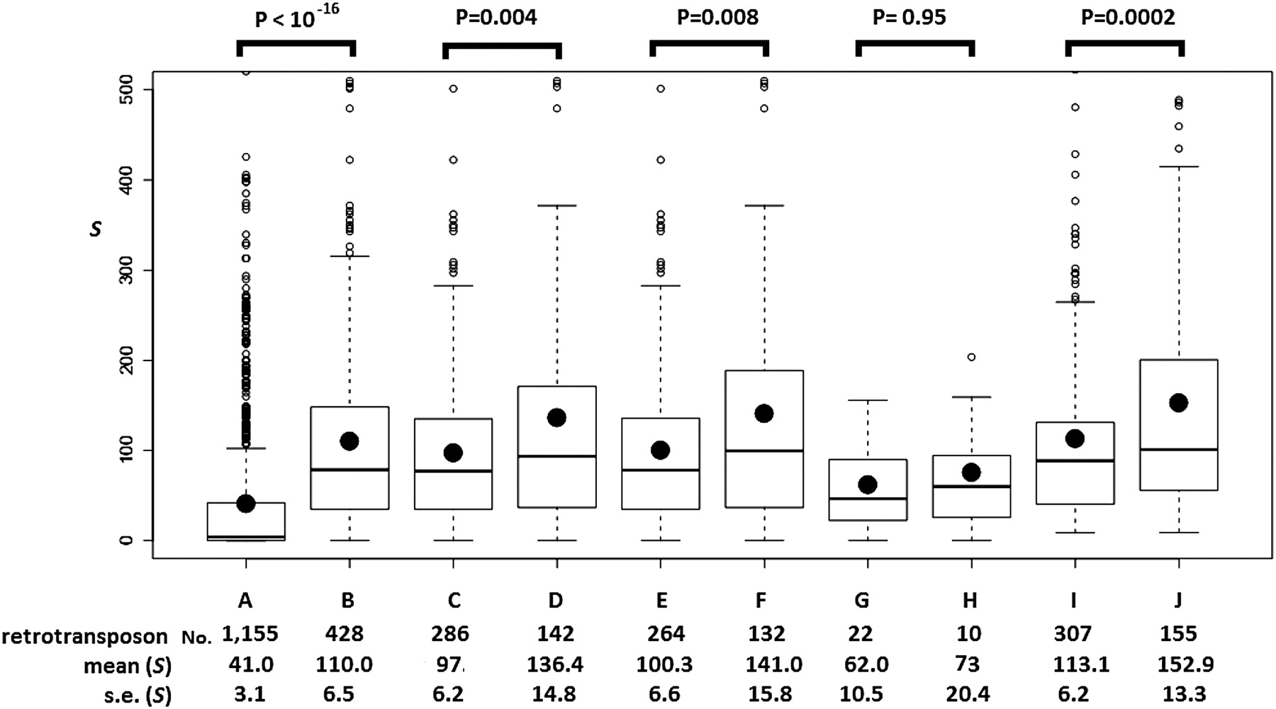 The boxplots of S scores for targetRTs (retrotransposons that are outside piRNA loci). (A) Nonautonomous/inactive retrotransposons. (B–H) Putatively autonomous targetRTs: (B) total putatively autonomous targetRTs; (C) rare autonomous targetRT insertions (the insertions only exist in the reference genome); (D) common autonomous targetRT insertions (the insertions exist in the reference genome and in at least one strain surveyed in this study or Gonzalez et al. 2008); (E) rare autonomous targetRT insertions in regions where recombination occurs; (F) common autonomous targetRT insertions in regions where recombination occurs; (G) rare autonomous targetRT insertions in nonrecombining regions; (H) common autonomous targetRT insertions in nonrecombining regions. The S scores of A–H are based on the small RNAs from the four piRNA libraries that are located inside the piRNA loci and perfectly antisense to TEs annotated in FlyBase R5.13 (see text). (I,J) S scores for all the putatively autonomous retrotransposons (inside and outside piRNA loci) with all the small RNAs in the four libraries (they can be inside piRNA loci or not). (I) The rare class; (J) the common class. The number of retrotransposon insertions in each category, the mean and standard error (SE) of S scores for each category appears below each boxplot. Kolmogorov-Smirnov tests were used to assess the statistical significance, and the P-values appear above the boxplots. In each boxplot, the minimum, 25%, 50%, and 75% quantiles, and the maximum S scores are represented by horizontal lines. The black dot is the mean S score. S scores greater than 500 are not plotted.