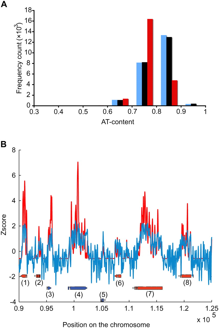 P. falciparum genome and its effect on nucleosome positioning. (A) AT-content distributions across the genome, FAIRE-enriched and MAINE-enriched regions were compared. AT-content was calculated in a 1000-bp-long sliding window for the P. falciparum genome (blue) and regions covered by FAIRE- and MAINE-seq (black and red, respectively). AT-content is similar genome-wide and in FAIRE-covered regions. On the contrary, regions enriched by MAINE are influenced toward less AT-rich regions, which is in agreement with the low affinity of nucleosomes for AT-rich sequences. Same distributions were obtained using sliding windows of various sizes (10, 50, 100, 1000, and 20,000 bp) (data not shown) further validating the efficiency of Illumina technology for the P. falciparum AT-rich genome. (B) Correlation between experimental and in silico nucleosome positioning was explored. MAINE profile (red) and DNA bending free energy profile (blue) were z-normalized and overlaid for the region [90,000–125,000] of chromosome 1. Oriented boxes represent gene models retrieved from http://www.plasmodb.org: (1) PFA0095c; (2) PFA0100c; (3) PFA0105w; (4) PFA0110w; (5) PFA0115w; (6) PFA0120c; (7) PFA0125c; (8) PFA0130c. Our results show that the energy profile correlates well with our experimental nucleosome landscape (average correlation coefficient = 0.65, measured using a 10-kb-long nonoverlapping sliding window approach), indicating that DNA bending properties dictates, at least partially, the parasite nucleosome positioning.