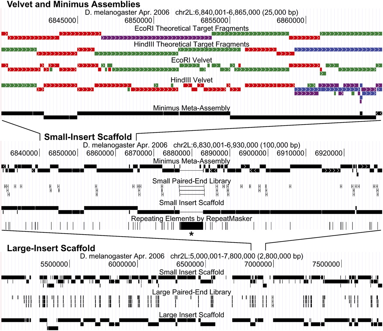 This is a screenshot from the UCSC Genome Browser exhibiting the alignment of each RR library to the reference genome. The top four tracks summarize the Velvet assembly steps. Contigs are color-coded by library as red (1–4 kb), green (4–7 kb), purple (7–9 kb), or blue (9–30 kb) bars. The top two tracks are the theoretical in silico restriction enzyme digested contigs. The actual EcoRI and HindIII contigs aligned back to the dm3 reference are show in the next two tracks. There is relatively little overlap between contigs in different libraries generated from the same restriction enzyme. The next track shows the RR meta-assembled contigs, resulting from merging the eight libraries with Minimus. Short and large genomic paired-end libraries facilitate the scaffolding of the contigs into the final assembly, shown in the bottom two panels. An LTR element deletion suggested by our assembly, marked by an asterisk (*) in the middle panel, was verified by alignment of the genomic paired-end reads flanking the deletion. If those read pairs contained the LTR element, their insert size would be several deviations larger than the mean for that library. The alignments depicted here are from the same region of chromosome 2 with the window zoomed out for each successive panel.