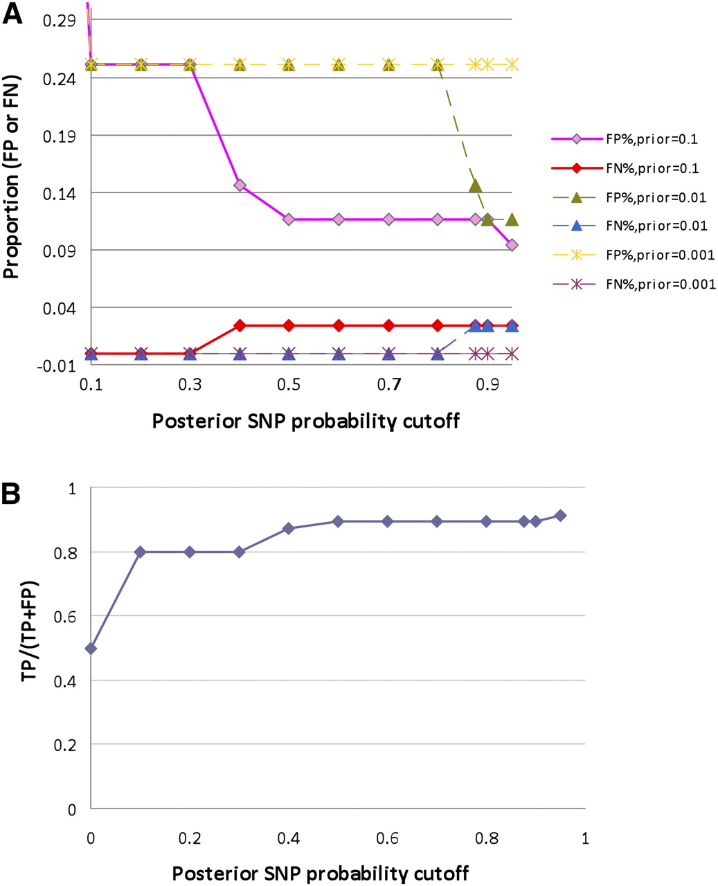 The validation results in S. aureus data with at least three variant reads when three different sets of priors were used for tuning purposes. We used three sets of priors (Supplemental Table S2) in Equation 5 for SNP probability assessment. (A) The false-positive rate (FP) and false-negative rate (FN) can be evaluated using our defined SNPs and errors (described in Methods). The results indicate that a 10% false-positive rate and a 5% false-negative rate can be achieved when using either the “set 1” or the “set 2” parameters, while “set 1” enables a smoother resolution. (B) The FP/[FP + true-positives (TP)] is plotted against the posterior SNP probability cutoff for results obtained using “set 1” priors.