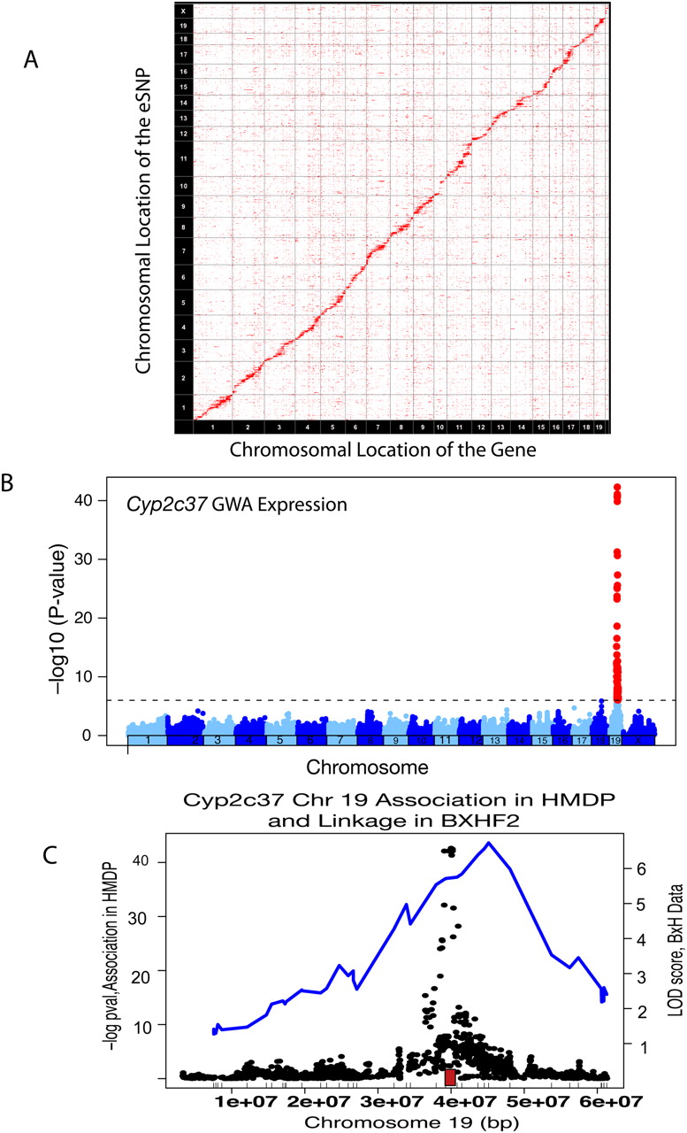 Expression SNPs from HMDP. (A) Transcript levels in liver of HMDP mice were profiled and significant associations are plotted according to chromosomal position (x-axis) versus the location of the structural gene (y-axis). The strong diagonal line represents cis-eQTL, whereas the remainder are trans-eQTL signals. (B) Genome-wide association results in the HMDP demonstrating a strong association for Cyp2c37 transcript levels in liver on chromosome 19. (C) Chromosome 19 specifically, with an overlay between the linkage results from the BXHApoe−/− F2 cross and the association from the HMDP panel for the Cyp2c37 cis-eQTL on chromosome 19. (Red box) The location of Cyp2c37. The tick marks on the x-axis are the location of the chromosome 19 markers used in the BXHApoe−/− F2 intercross.